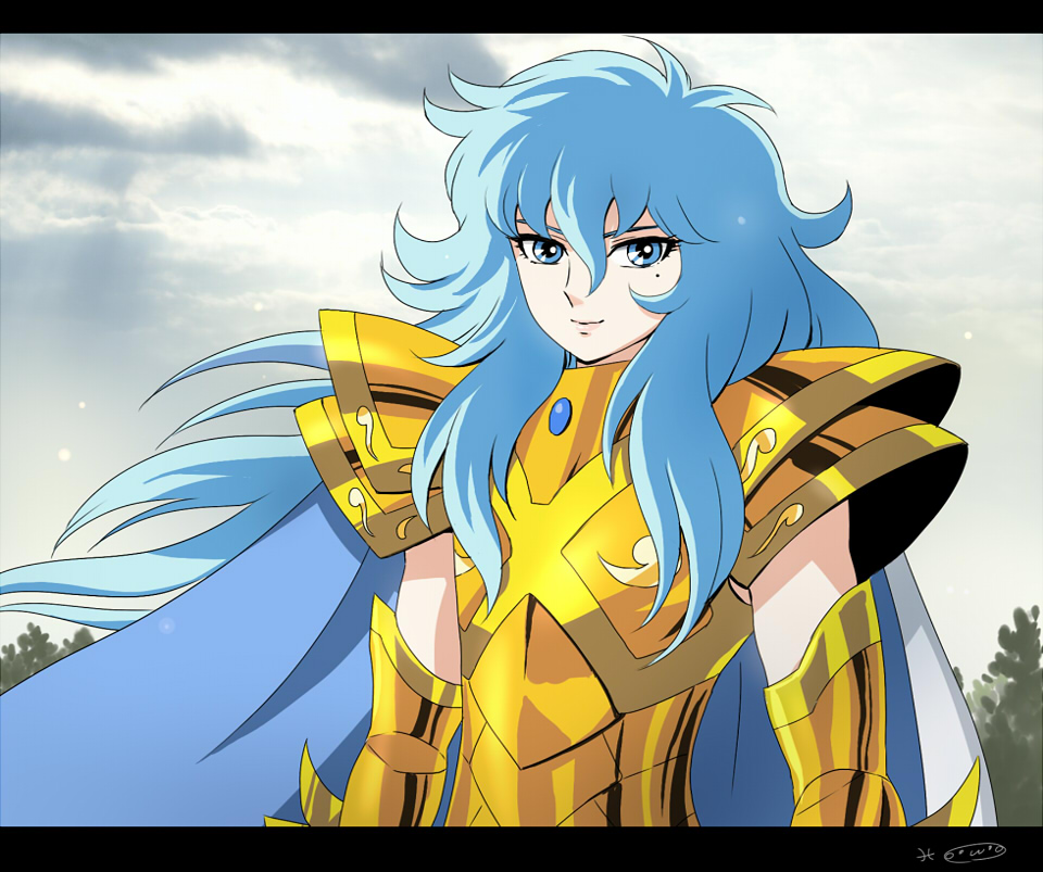 1boy araki_shingo_(style) armor blue_cape blue_eyes blue_gem blue_hair cape cloud cloudy_sky eyelashes gem gold_armor gold_cloth gold_saint long_hair looking_at_viewer male_focus mizuhara_aki mole mole_under_eye official_style outdoors pauldrons pisces_aphrodite saint_seiya shoulder_armor sky smile trap tree two-sided_cape two-sided_fabric upper_body white_cape