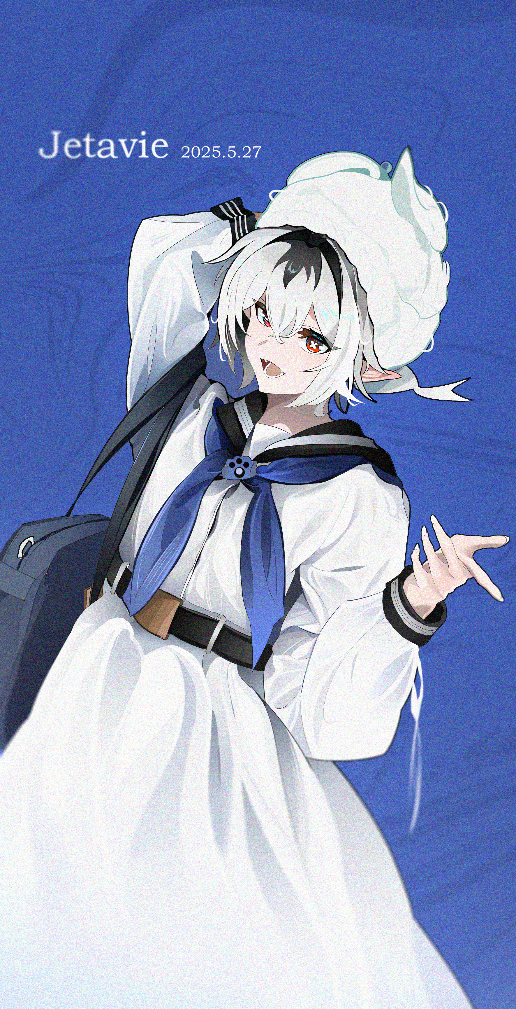 1girl absurdres alternate_costume bag belt black_belt black_hair black_sailor_collar blue_background blue_neckerchief dress fang fley-lan grey_hair highres jetavie_(pgr) long_sleeves looking_at_viewer mismatched_pupils multicolored_hair neckerchief open_mouth pointy_ears punishing:_gray_raven red_eyes sailor_collar shoulder_bag slit_pupils solo streaked_hair symbol-shaped_pupils towel towel_on_head white_dress x-shaped_pupils