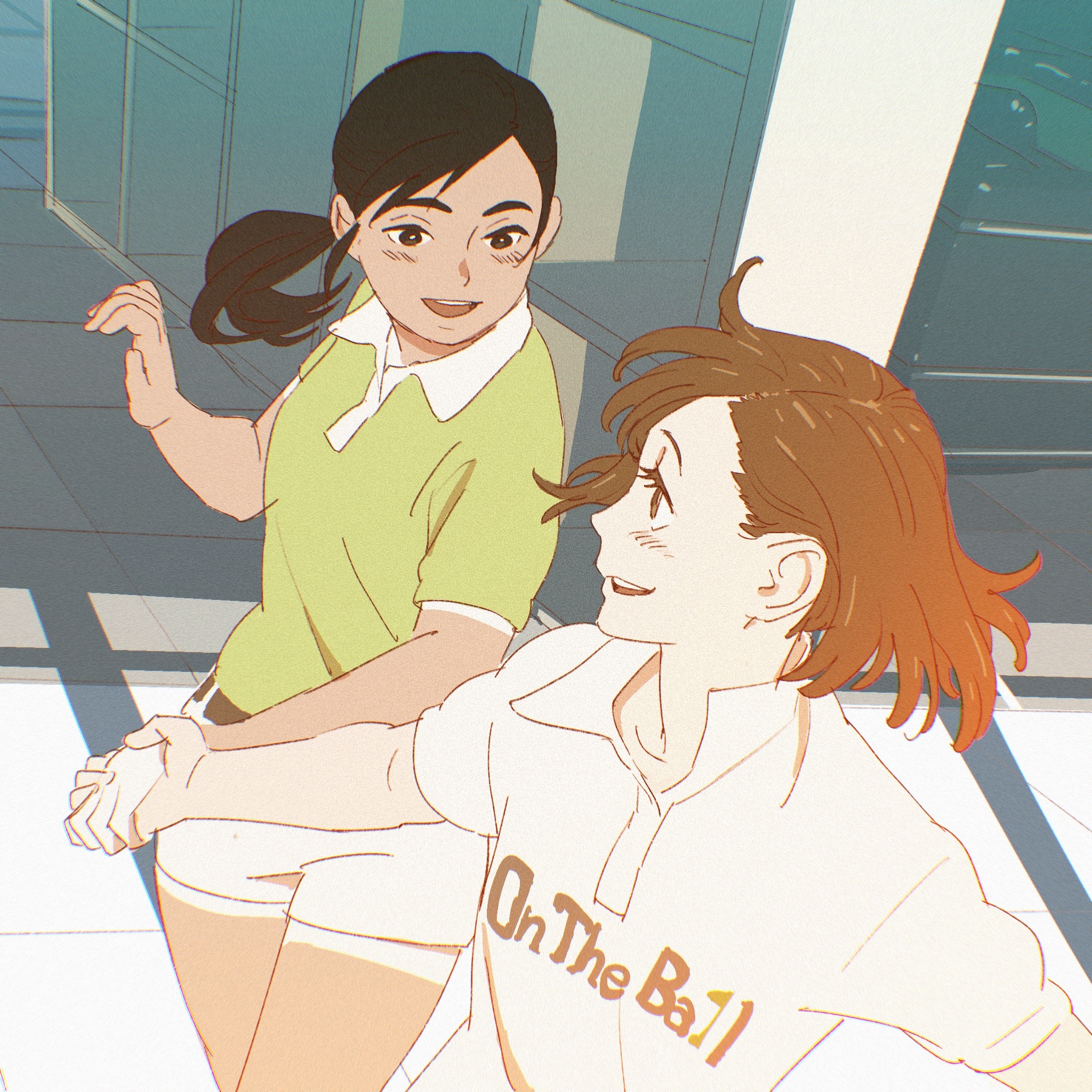 2girls 55bata6rou belt black_belt black_eyes black_hair brown_eyes brown_hair character_request clothes_writing collared_shirt copyright_request cowboy_shot green_shirt highres holding_hands indoors long_hair looking_at_another looking_back multiple_girls open_mouth ponytail print_shirt shirt short_hair shorts smile standing tan tanline tile_floor tiles white_shirt white_shorts window_shadow