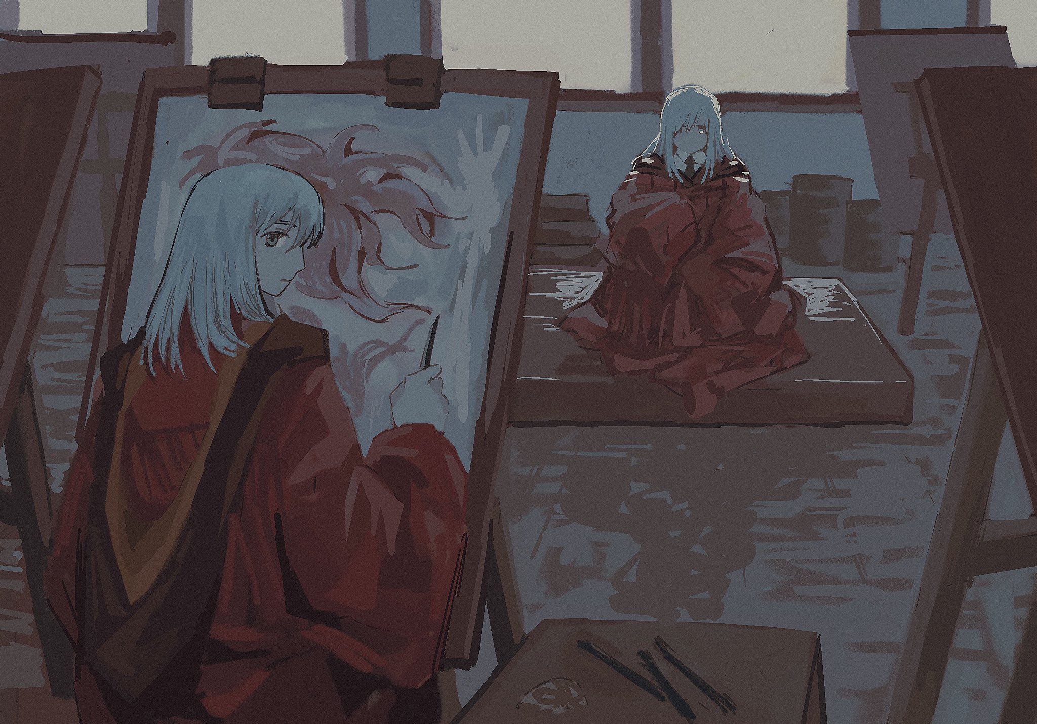 1other closed_mouth cyberseaurchin easel expressionless floor from_behind highres indoors long_hair original painting_(action) painting_(object) red_robe robe sitting standing white_hair