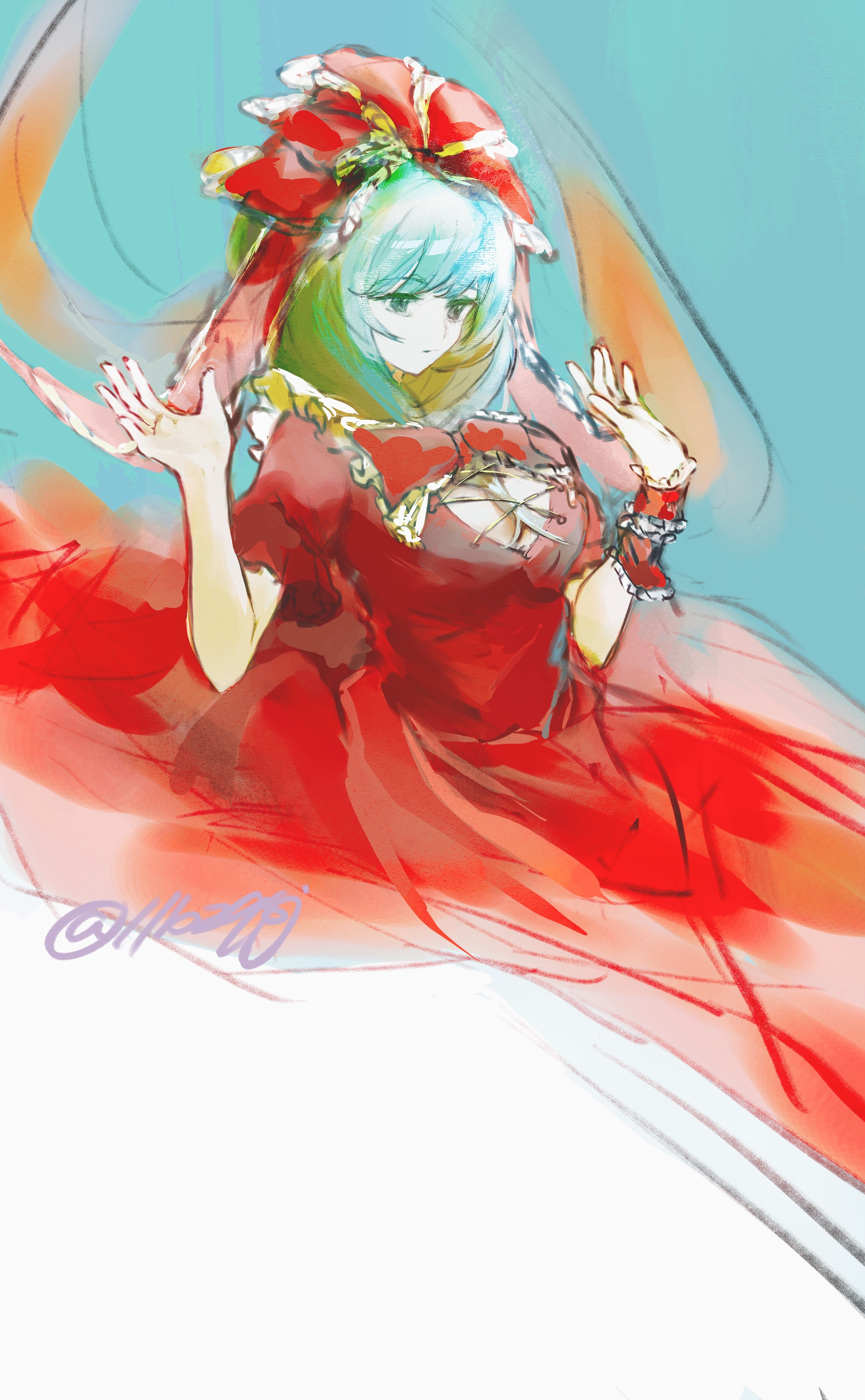 1girl absurdres arm_ribbon arms_up bow breasts dress frilled_bow frilled_ribbon frills front_ponytail green_eyes green_hair hair_bow hair_ribbon highres kagiyama_hina llbzqsj long_hair red_bow red_dress red_ribbon ribbon short_sleeves solo tagme touhou twitter_username