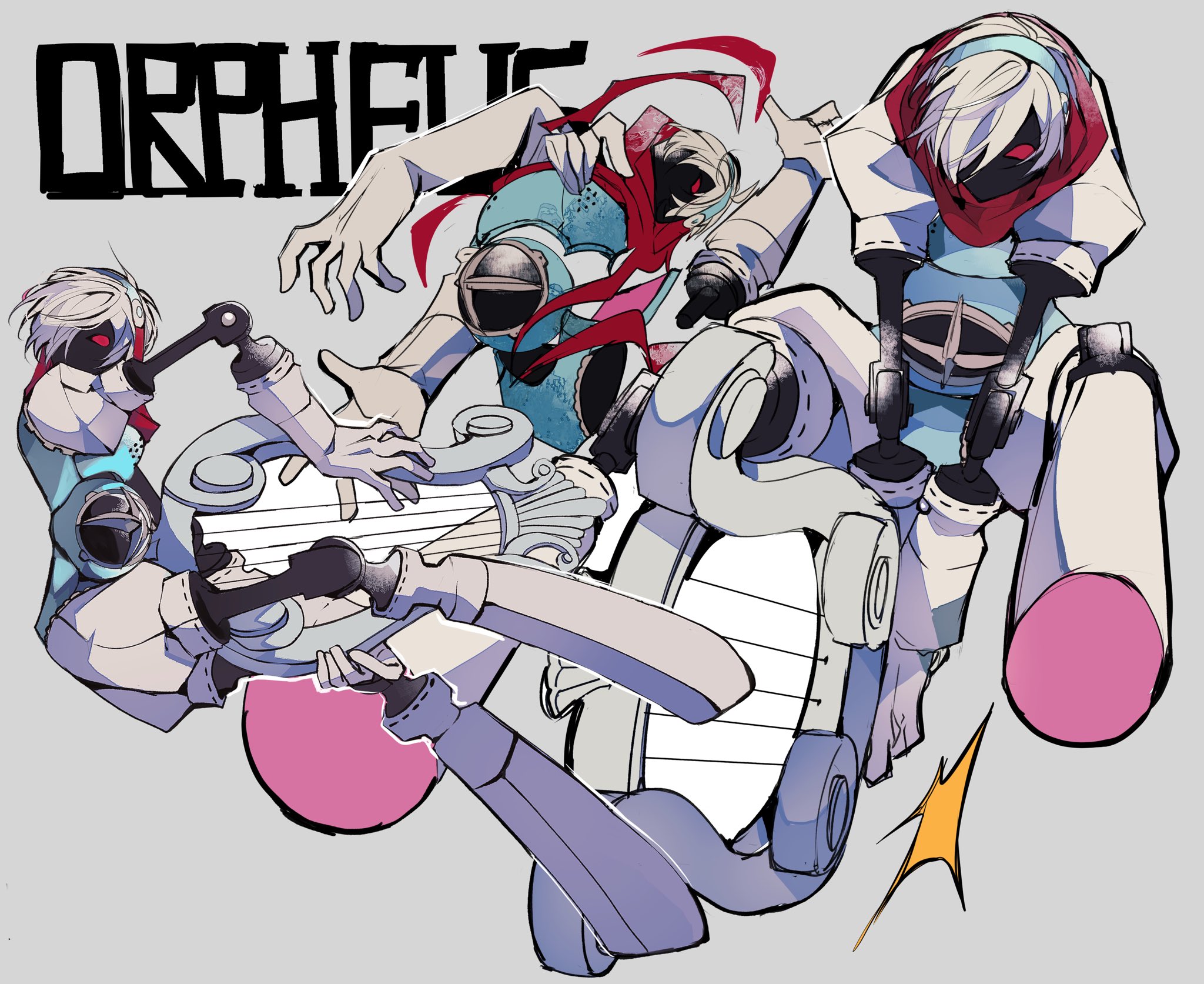 1boy aqua_hairband character_name hairband harp highres instrument male_focus multiple_views no_humans orpheus_(persona) persona persona_3 red_eyes red_scarf robot_boy scarf solo teketeke_(tasutekete) white_background white_hair