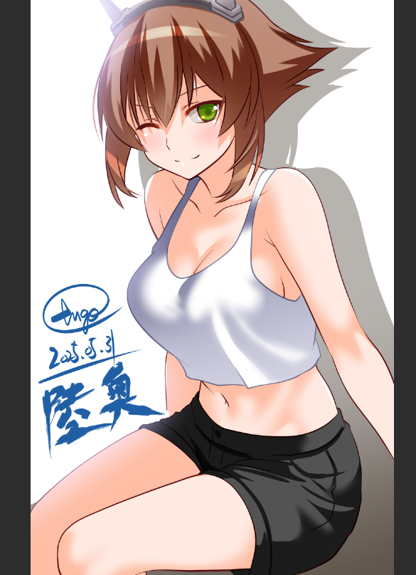 1girl alternate_costume black_shorts brown_hair casual character_name commentary_request dated engo_(aquawatery) feet_out_of_frame flipped_hair green_eyes headgear kantai_collection mutsu_(kancolle) one_eye_closed radio_antenna short_hair shorts signature simple_background sitting smile solo tank_top white_background white_tank_top