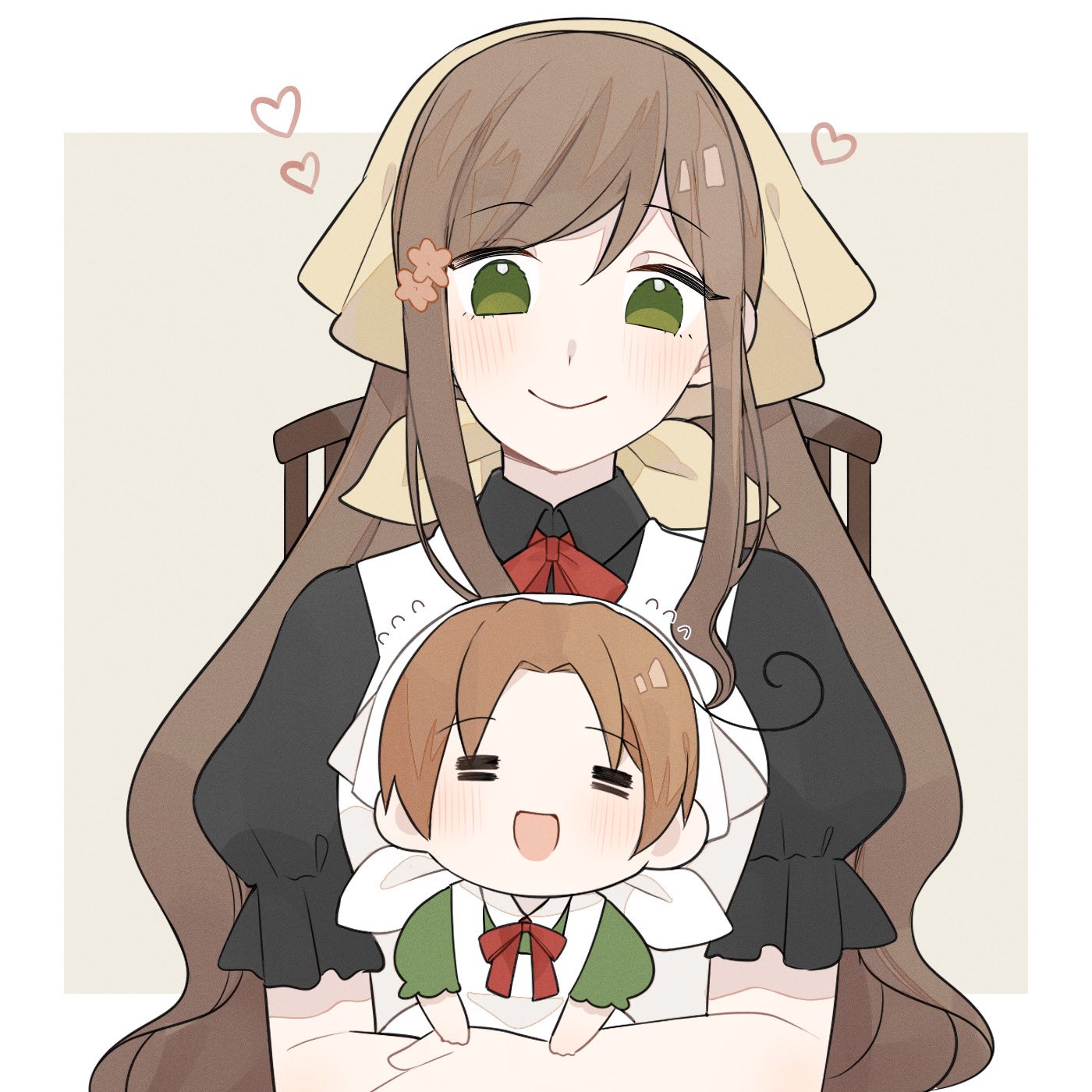1boy 1girl ahoge apron axis_powers_hetalia black_dress blush border bow bowtie brown_hair chair chibitalia_(hetalia) child closed_eyes closed_mouth collared_dress commentary dress flower flying_sweatdrops green_dress green_eyes grey_background hair_between_eyes hair_flower hair_ornament headscarf heart highres hug hungary_(hetalia) long_hair looking_at_another northern_italy_(hetalia) on_chair open_mouth outside_border pink_flower puffy_short_sleeves puffy_sleeves red_bow red_bowtie short_hair short_sleeves sidelocks simple_background sitting smile untranslatable_commentary to_min_xxx wavy_hair white_apron white_border white_headscarf yellow_headscarf