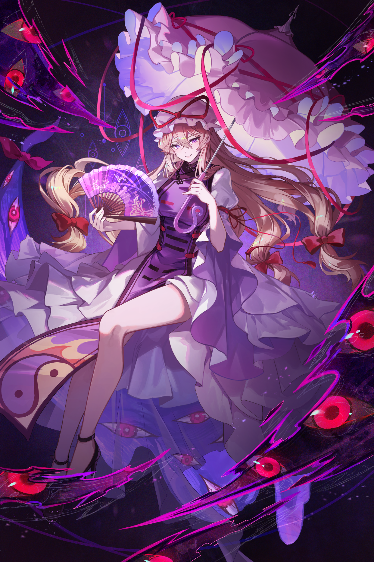 1girl black_background blonde_hair bow breasts disembodied_eye dress folding_fan full_body gap_(touhou) hair_bow hand_fan hat hat_ribbon highres holding holding_fan holding_umbrella kyusoukyu large_breasts long_hair long_sleeves looking_at_viewer mob_cap purple_eyes purple_tabard red_bow red_ribbon ribbon shoes solo tabard touhou trigram umbrella very_long_hair white_dress white_hat wide_sleeves yakumo_yukari yin_yang yin_yang_print