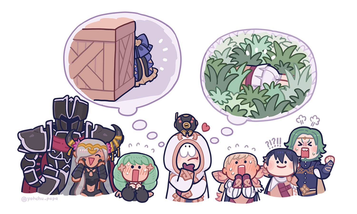 alfonse_(fire_emblem) angry armor black_knight_(fire_emblem) blonde_hair blue_hair blush box brother_and_sister cape chibi embarrassed fire_emblem fire_emblem_heroes flayn_(fire_emblem) gloves grass hair_ornament happy horns kiran_(fire_emblem) long_hair multicolored_hair multiple_boys multiple_girls mushi_rags nintendo open_mouth seteth_(fire_emblem) sharena_(fire_emblem) short_hair siblings simple_background smile speech_bubble sweat thought_bubble zelestia_(fire_emblem) zelgius_(fire_emblem)