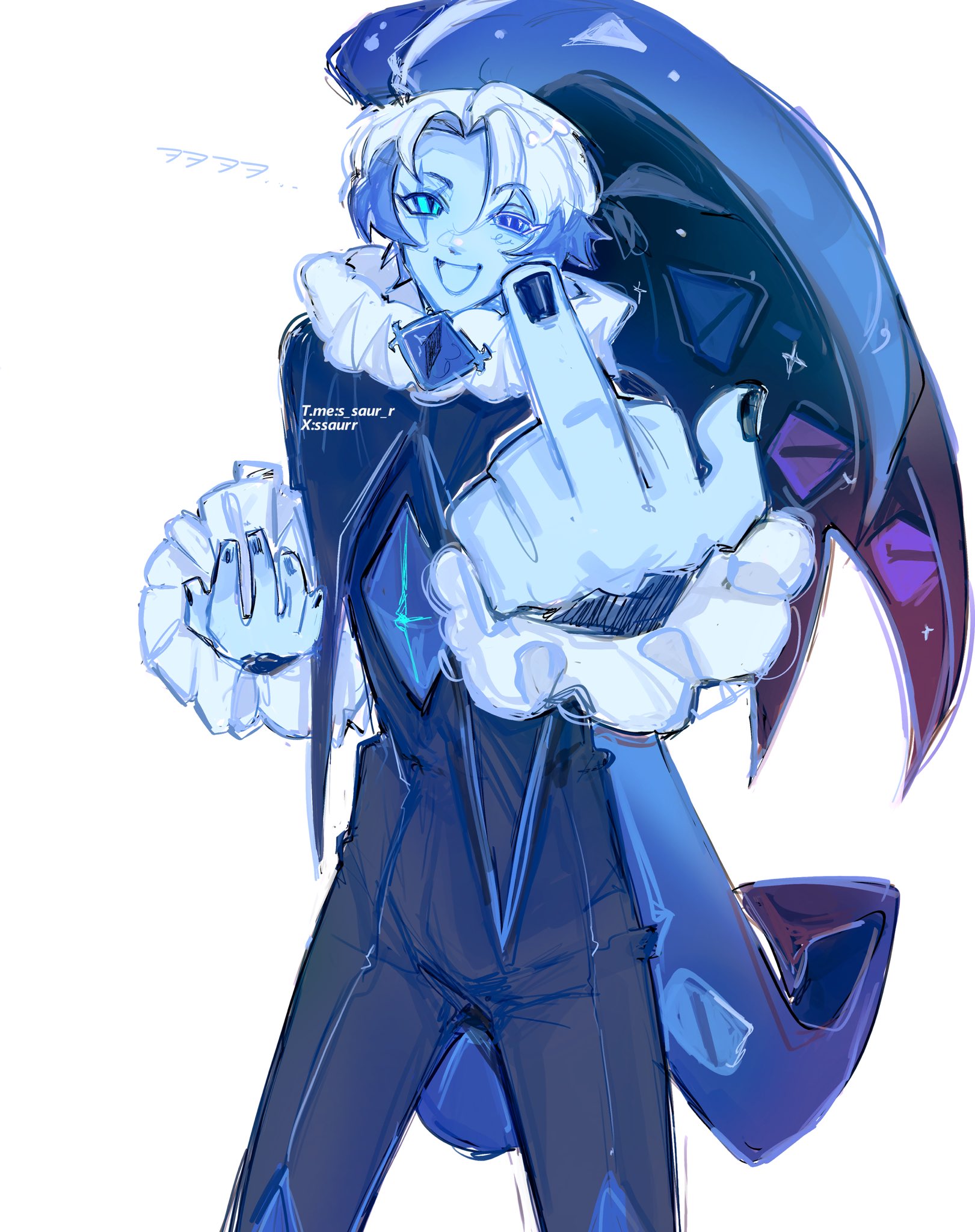 1boy animification blue_eyes blue_skin brooch colored_skin cookie_run cookie_run:_kingdom fflyaga hat highres humanization jewelry long_hair long_sleeves looking_at_viewer male_focus middle_finger neck_ruff puffy_long_sleeves puffy_sleeves shadow_milk_cookie simple_background smile solo very_long_hair white_hair