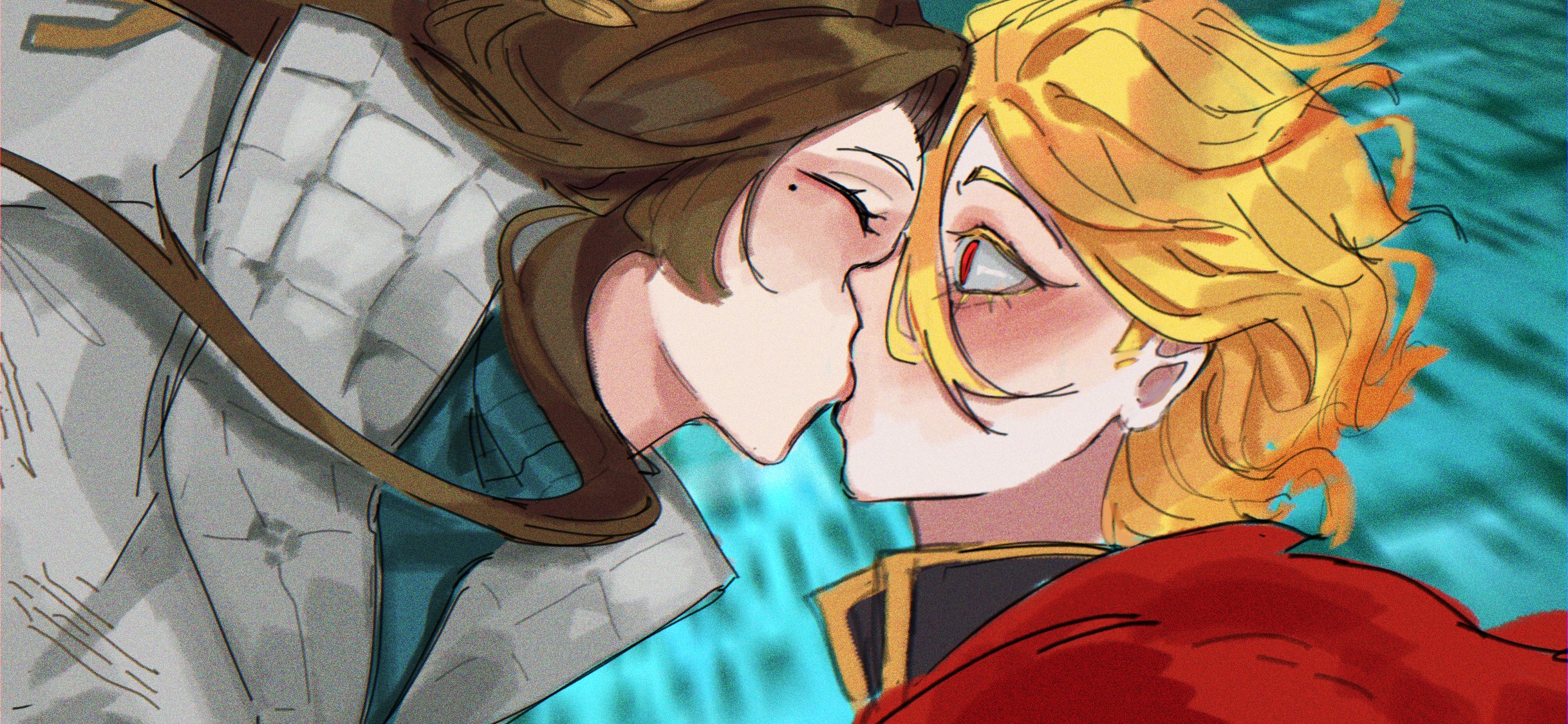 2girls blonde_hair blue_background blue_sweater brown_hair closed_eyes coat don_quixote_(project_moon) e.g.o_(project_moon) grey_coat highres kiss limbus_company long_hair looking_at_another mircalladesire mole mole_under_eye multiple_girls project_moon pursuance_(e.g.o) red_eyes rodion_(project_moon) sancho_(project_moon) short_hair simple_background sweater upper_body yuri