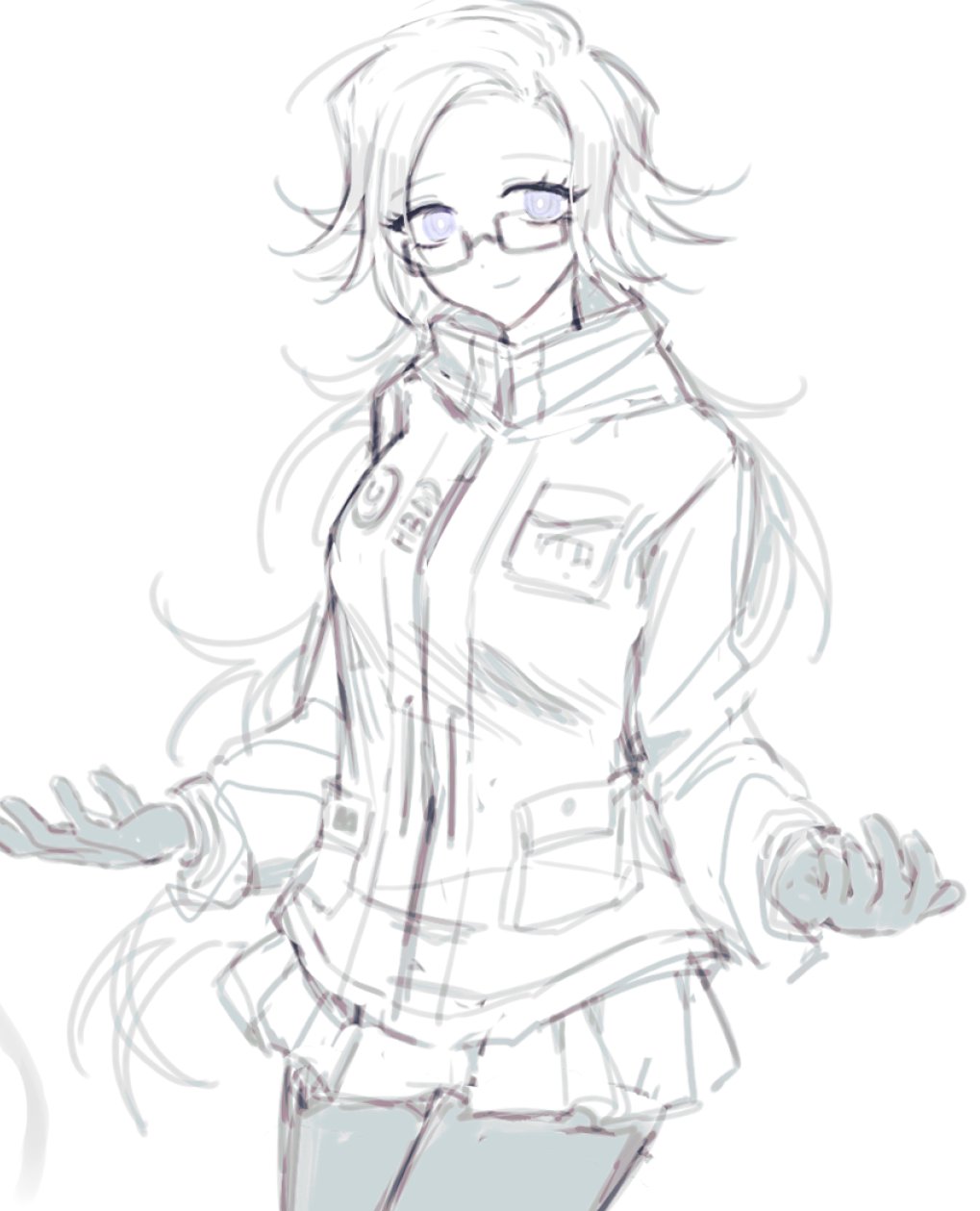 100horses 1girl aotsuki_eito black_gloves blue_eyes female_focus genderswap genderswap_(mtf) glasses gloves highres long_hair looking_at_viewer pleated_skirt simple_background sketch skirt solo solo_focus standing the_hundred_line_-last_defense_academy- upper_body white_background