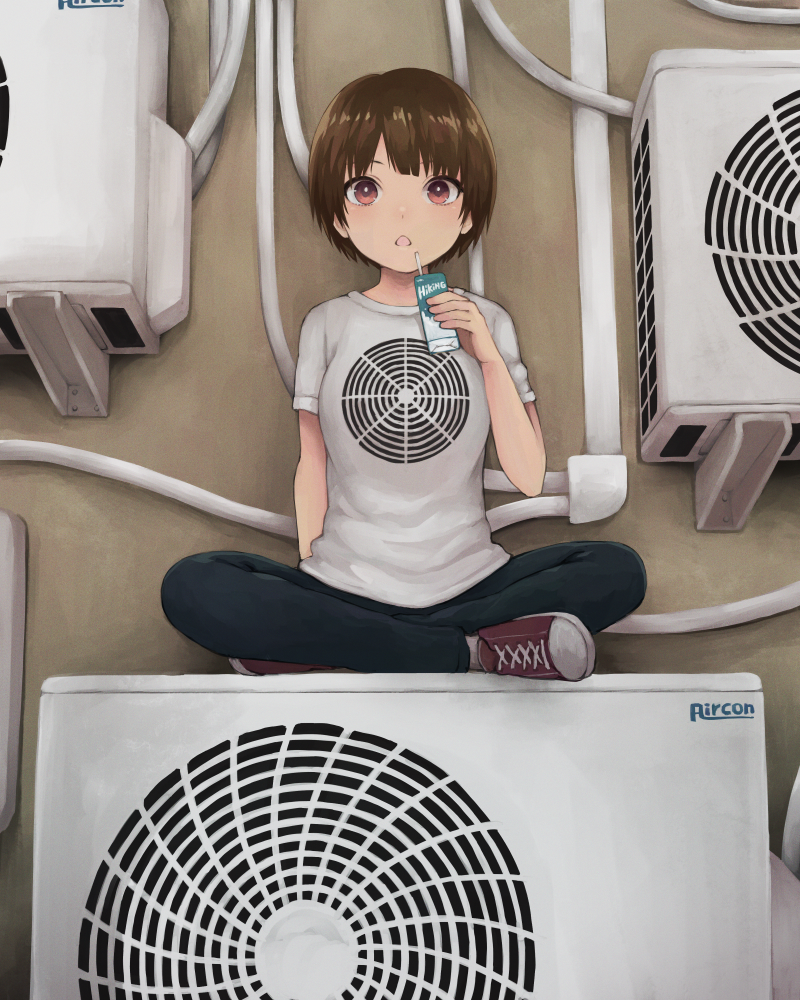 1girl breasts brown_eyes brown_hair commentary_request condenser_unit drink holding holding_drink indian_style looking_at_viewer medium_breasts open_mouth original shirt short_hair sitting solo t-shirt yajirushi_(chanoma)