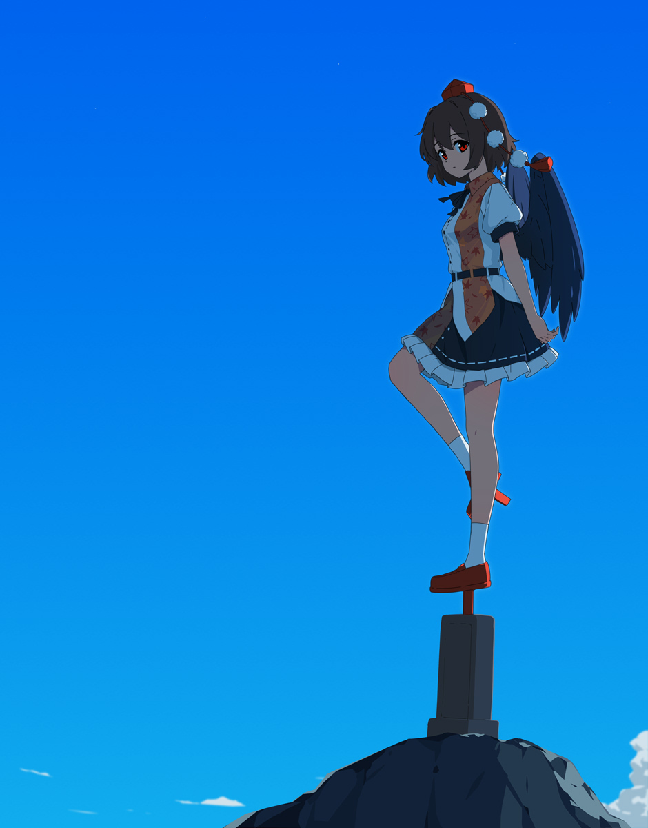 1girl black_ribbon black_skirt black_wings blue_sky brown_hair closed_mouth commentary_request day feathered_wings frilled_skirt frills full_body geta hat highres looking_at_viewer mountain neck_ribbon necono_(nekonosora1207) outdoors pom_pom_(clothes) red_eyes red_hat red_shoes ribbon shameimaru_aya shirt shoes short_hair short_sleeves skirt sky solo standing tengu-geta tokin_hat touhou white_shirt wings