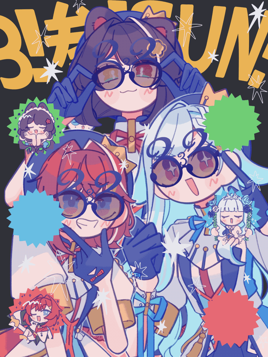 +_+ 3girls :3 :d adjusting_eyewear ange_katrina ange_katrina_(1st_costume) animal_ears animated animated_gif beret black_background blue_eyes blue_gloves blue_hair blue_hat blue_ribbon blush braid brown_hair chibi chibi_inset colored_inner_hair commentary_request crossed_bangs crown_hat_ornament dog_ears finger_to_cheek gloves grin group_picture hair_intakes hair_ornament half_gloves hands_up hat heterochromia highres ichimaru_(ichimarururu514) idol_clothes index_finger_raised inui_toko inui_toko_(1st_costume) jacket lize_helesta lize_helesta_(1st_costume) looking_at_viewer looping_animation matching_eyewear medium_hair multicolored_hair multiple_girls neck_ribbon nijisanji nijisanji_idol_uniform number_glasses open_mouth purple_eyes red_eyes red_hair red_ribbon ribbon sanbaka_(nijisanji) sanbaka_anniversary_outfit sebastian_piyodore short_sleeves single_hair_intake smile star_(symbol) streaked_hair swept_bangs tinted_eyewear two-tone_hair virtual_youtuber white_hair white_jacket white_wrist_cuffs wrist_cuffs wrist_ribbon yellow_eyes
