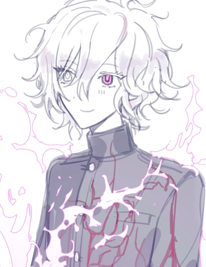 100horses 1boy ahoge closed_mouth fire hair_between_eyes heterochromia looking_at_viewer male_focus messy_hair multicolored_eyes pink_eyes pink_fire shion_(hundred_line) simple_background sketch smile solo solo_focus the_hundred_line_-last_defense_academy- white_eyes white_hair