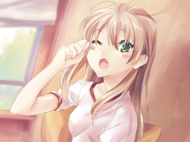 1girl ;o alternate_hairstyle artist_request blonde_hair blush blush_stickers eyelashes game_cg green_eyes hair_down ibarazaki_emi indoors katawa_shoujo long_hair looking_at_viewer non-web_source official_art one_eye_closed open_mouth shirt short_sleeves sidelocks sleepy solo white_shirt window