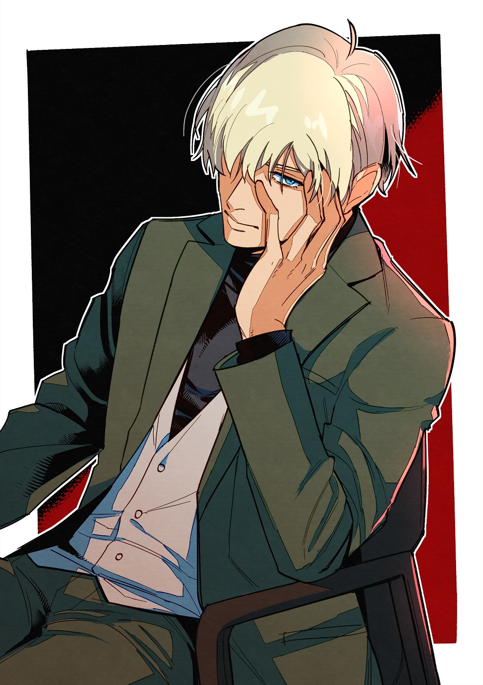 1boy black_background black_shirt blonde_hair blue_eyes border chair char_aznable commentary_request green_jacket gundam gundam_gquuuuuux hair_over_one_eye highres jacket long_sleeves looking_at_viewer male_focus on_chair red_background sa1korokorokoro shirouzu_(gundam) shirt short_hair sitting solo turtleneck white_border