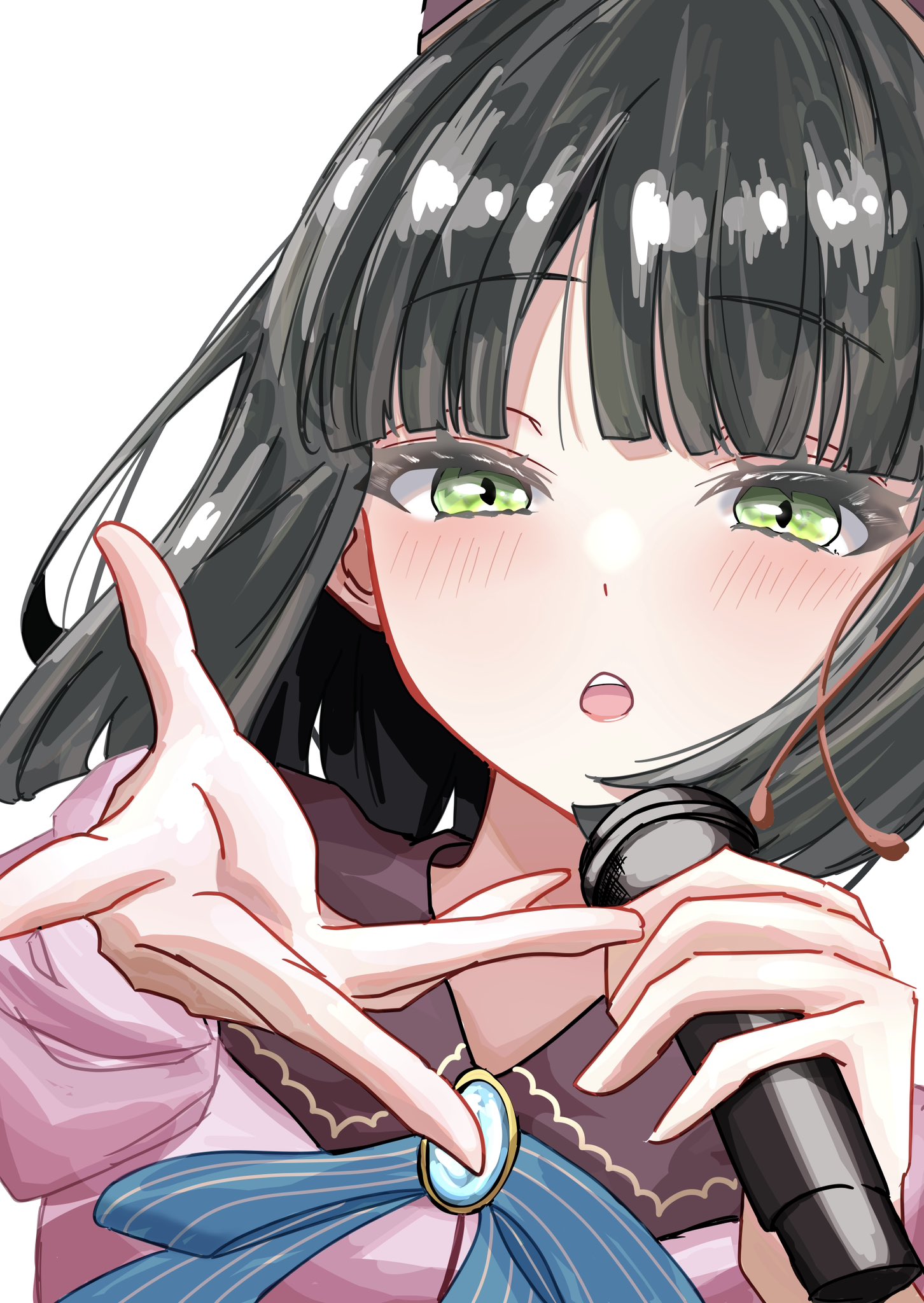 1girl :o beret blue_ribbon blunt_bangs blunt_ends bob_cut brooch brown_hat collared_dress commentary contrast_collar curled_fingers dream_believers dress green_eyes hashtag-only_commentary hat highres holding holding_microphone jewelry link!_like!_love_live! love_live! microphone momose_ginko neck_ribbon official_alternate_costume open_hand open_mouth pink_dress rere_88rere ribbon short_hair simple_background solo teeth upper_body upper_teeth_only virtual_youtuber white_background