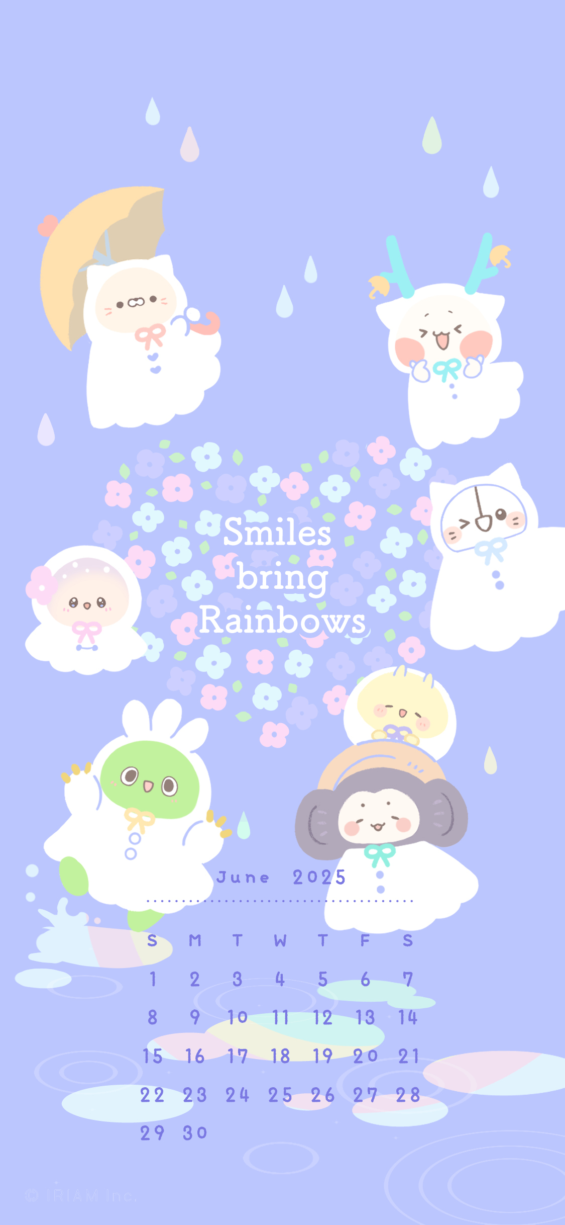2025 :d ;d absurdres antlers bukucha_(iriam) calendar_(medium) commentary_request english_text flat_color flower heart highres holding holding_umbrella horns hoshiika_(iriam) iriam monkey nekocoro_(iriam) no_humans official_art one_eye_closed open_mouth puddle purple_background raincoat sabobon_(iriam) shirasu_(iriam) smile tsumumaru_(iriam) umbrella water_drop yuramii_(iriam)