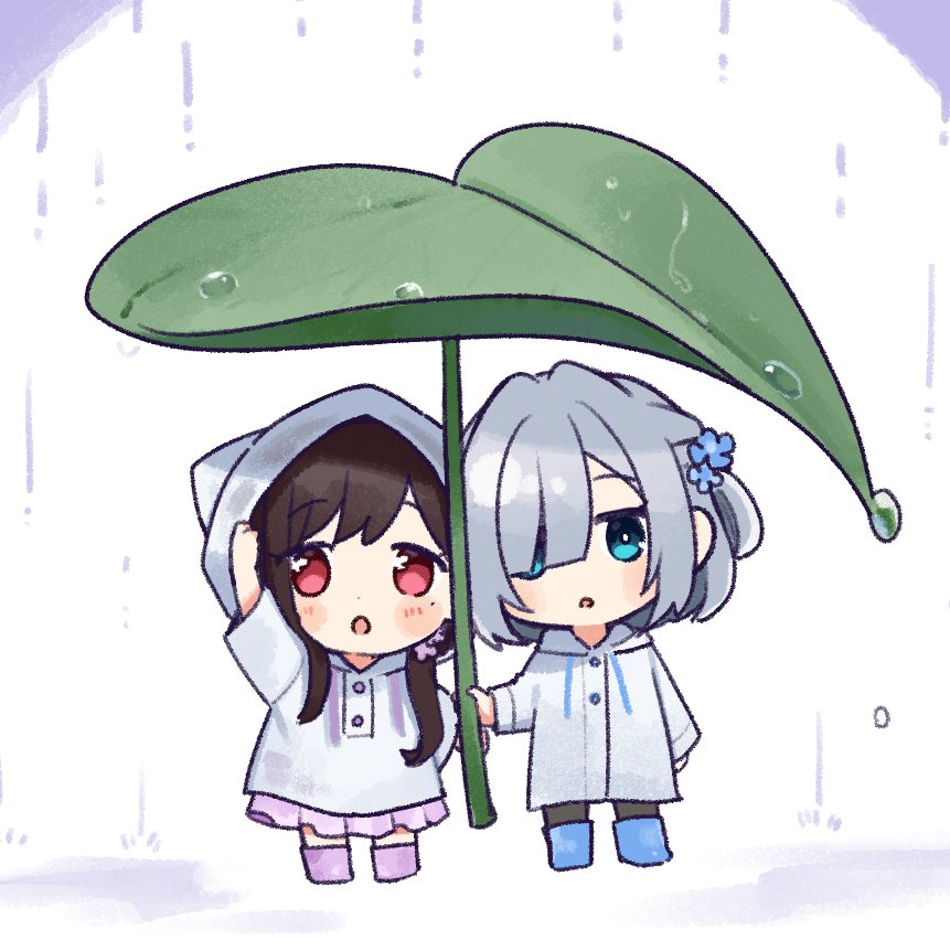 2girls asaka_kaori blue_eyes brown_hair chibi chibi_only commentary_request hair_over_one_eye hood hood_up hoshikawa_shizuku kimi_to_tsuzuru_utakata long_hair multiple_girls open_mouth oversized_plant rain raincoat red_eyes short_hair white_hair white_raincoat yuama