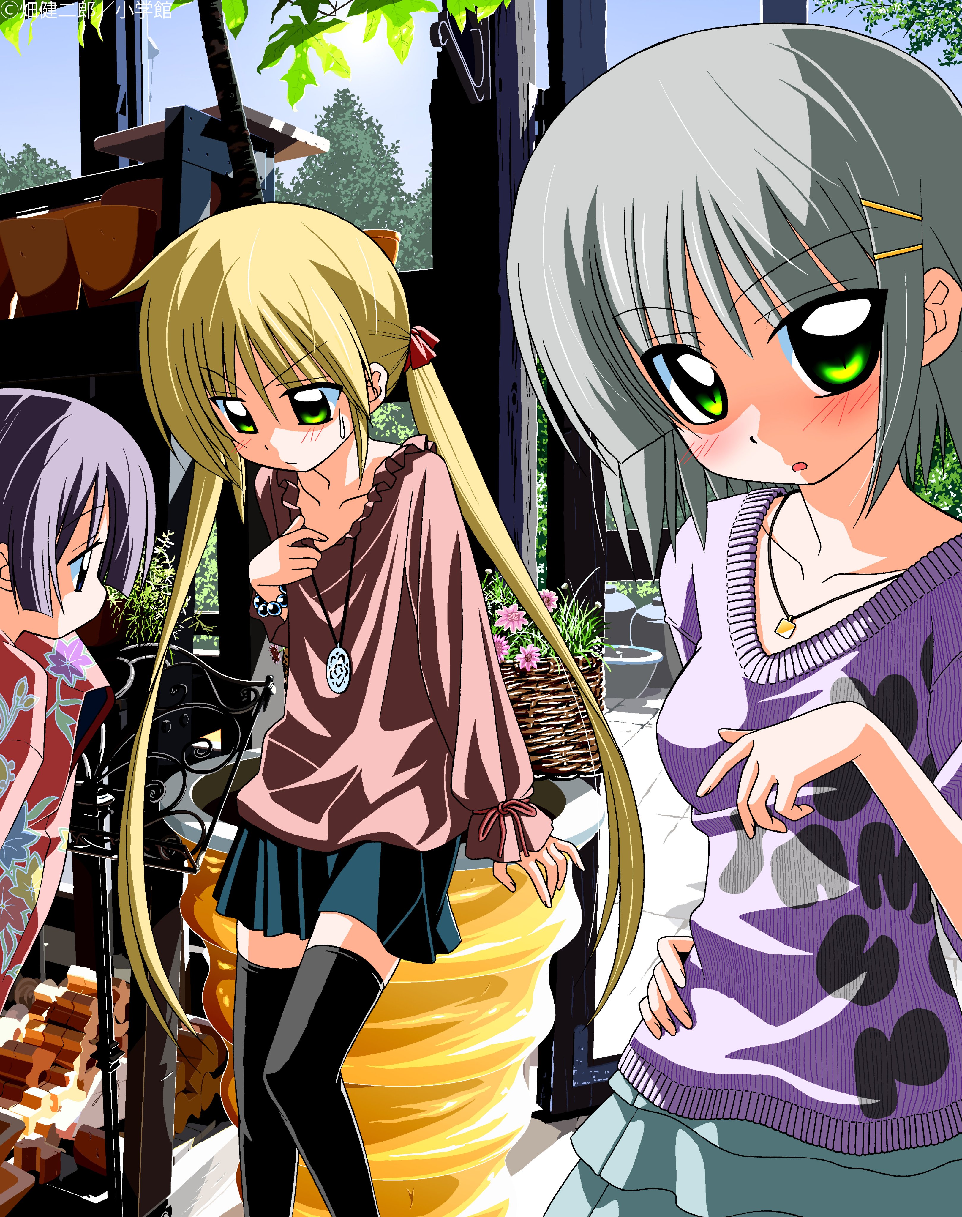 3girls absurdres aizawa_sakuya blonde_hair breasts child collarbone dress green_eyes grey_hair hata_kenjirou hayate_no_gotoku! highres japanese_clothes jewelry kimono long_hair matching_hair/eyes medium_breasts multiple_girls necklace official_art outdoors purple_eyes purple_hair saginomiya_isumi sanzen'in_nagi skirt thighhighs twintails zettai_ryouiki