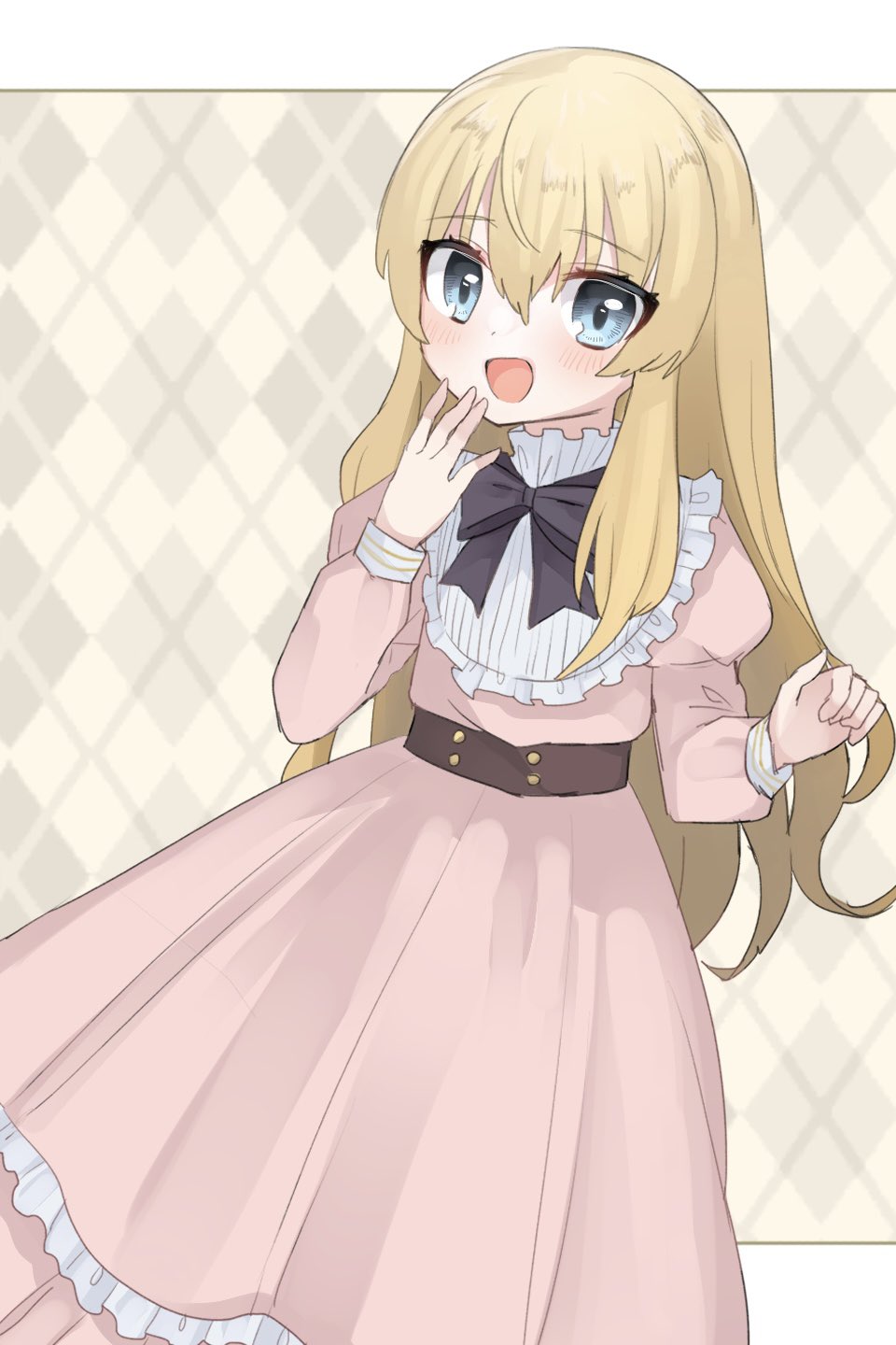 1girl argyle_background black_ribbon blonde_hair blue_eyes blush capelet child dress eyebrows_hidden_by_hair flat_chest hair_between_eyes hand_to_own_mouth highres juliet_sleeves long_hair long_sleeves looking_at_viewer neck_ribbon open_mouth pink_dress puffy_sleeves ribbon richi rougo_ni_sonaete_isekai_de_8-manmai_no_kinka_wo_tamemasu sabine_(roukin_8) sabine_von_zegleius smile solo white_capelet