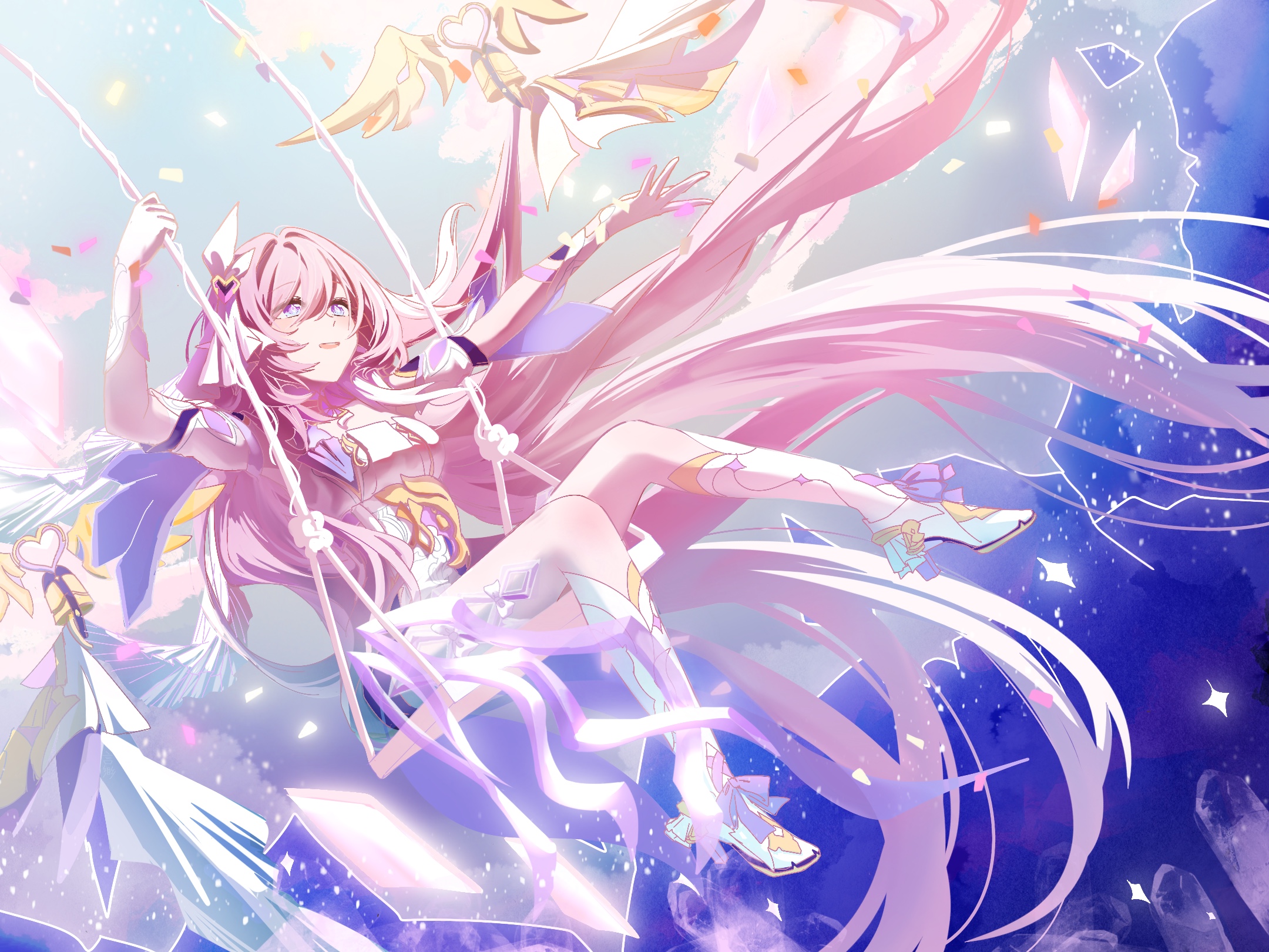 1girl diamond-shaped_pupils diamond_(shape) elf elysia_(herrscher_of_human:_ego)_(honkai_impact) elysia_(honkai_impact) gloves hair_between_eyes hair_ornament highres honkai_(series) honkai_impact_3rd long_hair petals pink_eyes pink_hair pointy_ears solo star_(sky) swing symbol-shaped_pupils very_long_hair white_gloves yan_miao