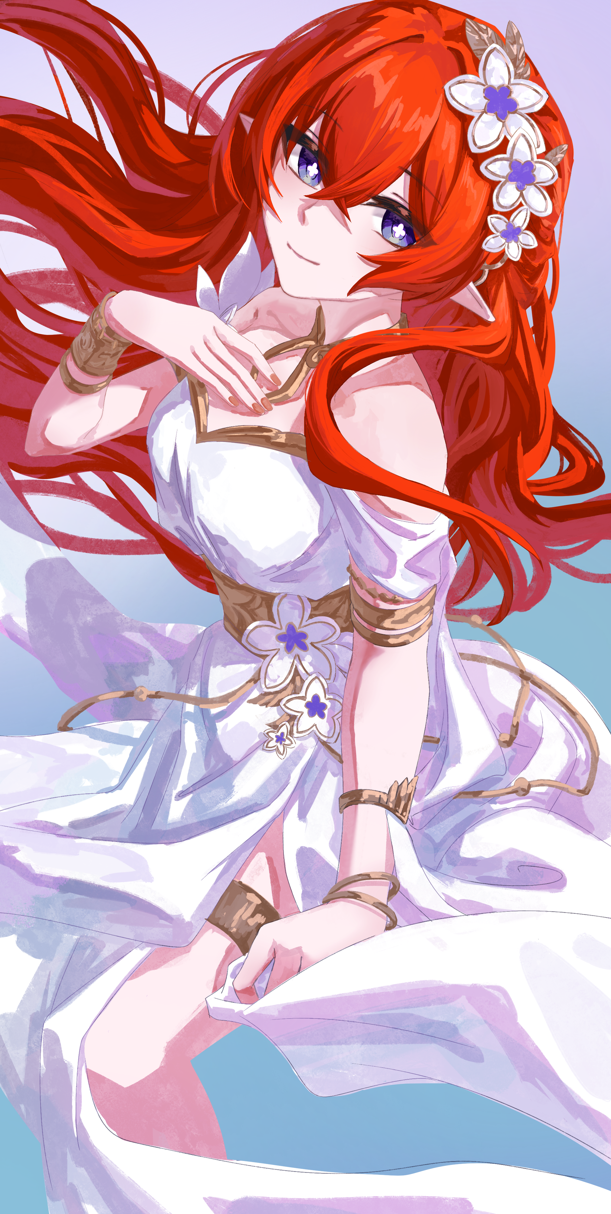 1girl absurdres ancient_greek_clothes bare_shoulders blue_eyes cross-shaped_pupils dress flower greco-roman_clothes hair_flower hair_ornament highres honkai:_star_rail honkai_(series) long_hair looking_at_viewer pointy_ears red_hair red_nails smile solo symbol-shaped_pupils tribios_(honkai:_star_rail) white_dress yan_miao