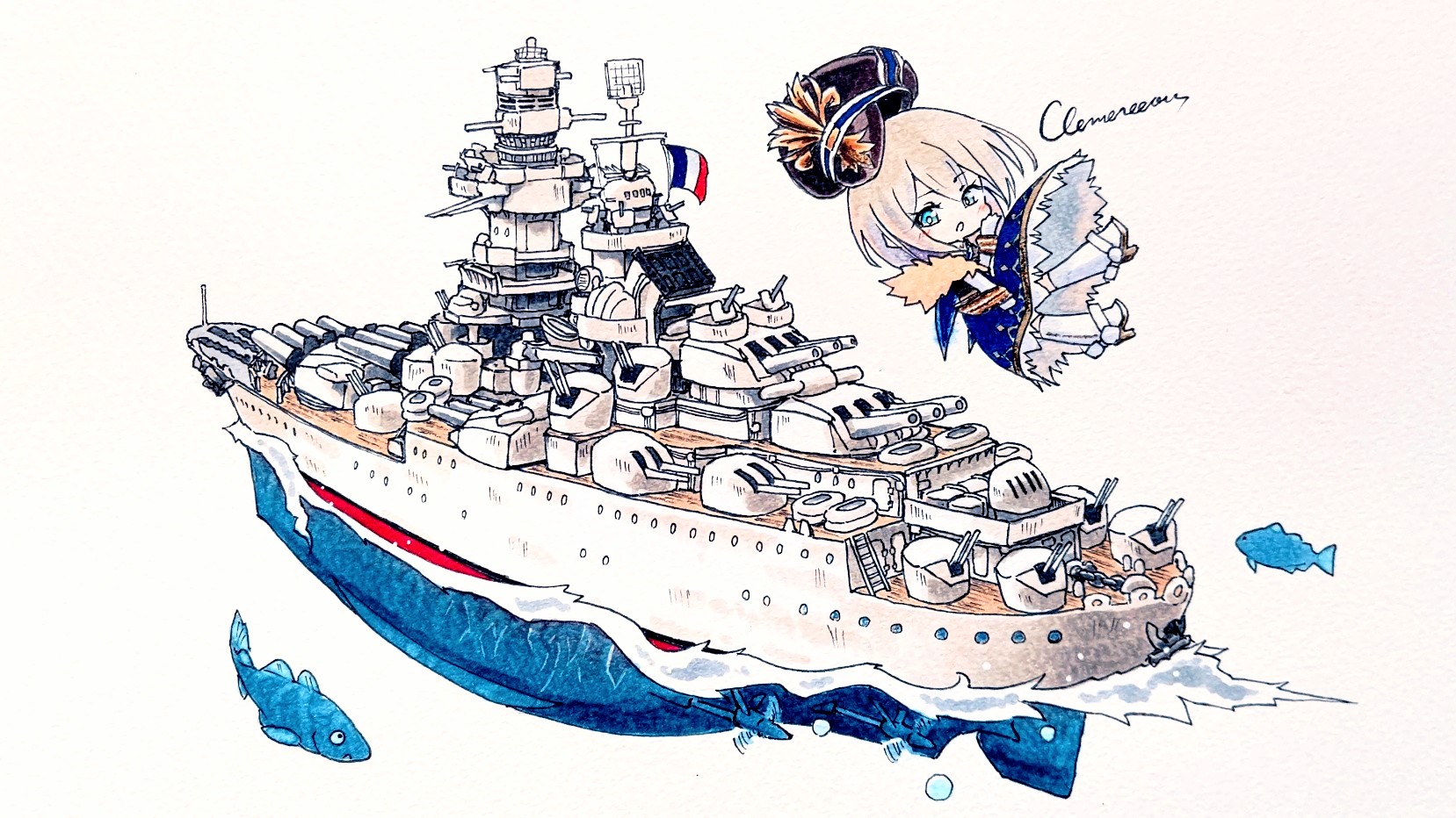 1girl anti-aircraft anti-aircraft_gun black_hat blonde_hair blue_eyes character_name chibi chibi_only clemenceau_(warship_girls_r) french_flag hat highres kikusui_karakuchi marker_(medium) military_vehicle peaked_cap ship ship_turret short_hair simple_background solo traditional_media warship warship_girls_r water watercraft white_background