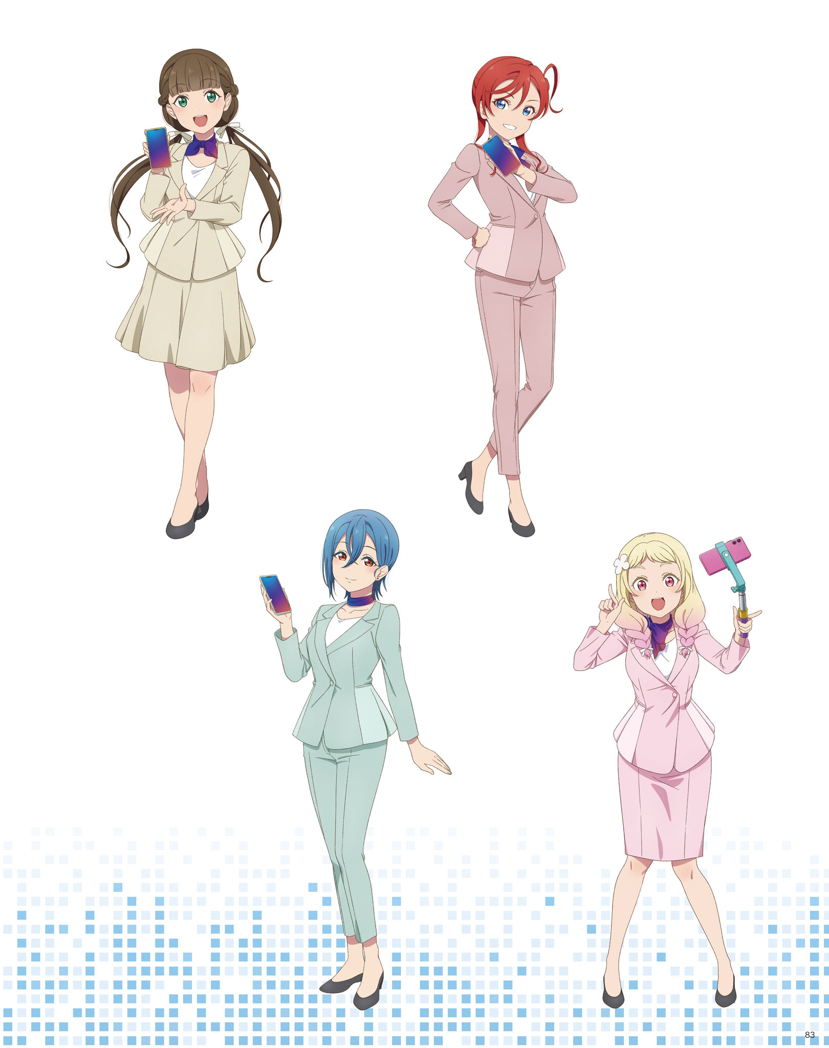 4girls artbook blonde_hair blue_eyes blue_hair brown_hair choker flower formal_clothes full_body green_eyes green_pants green_suit hair_between_eyes hair_flower hair_ornament hand_on_own_hip high_heels highres holding jacket liella!_second_generation long_hair looking_at_viewer love_live! love_live!_superstar!! low_twintails multicolored_hair multiple_girls non-web_source office_lady official_art onitsuka_natsumi open_mouth orange_eyes pants pencil_skirt pink_eyes pink_jacket pink_pants pink_shirt pink_skirt pink_suit red_hair sakurakoji_kinako shirt short_hair skirt smile standing suit twintails wakana_shiki white_background white_shirt yoneme_mei