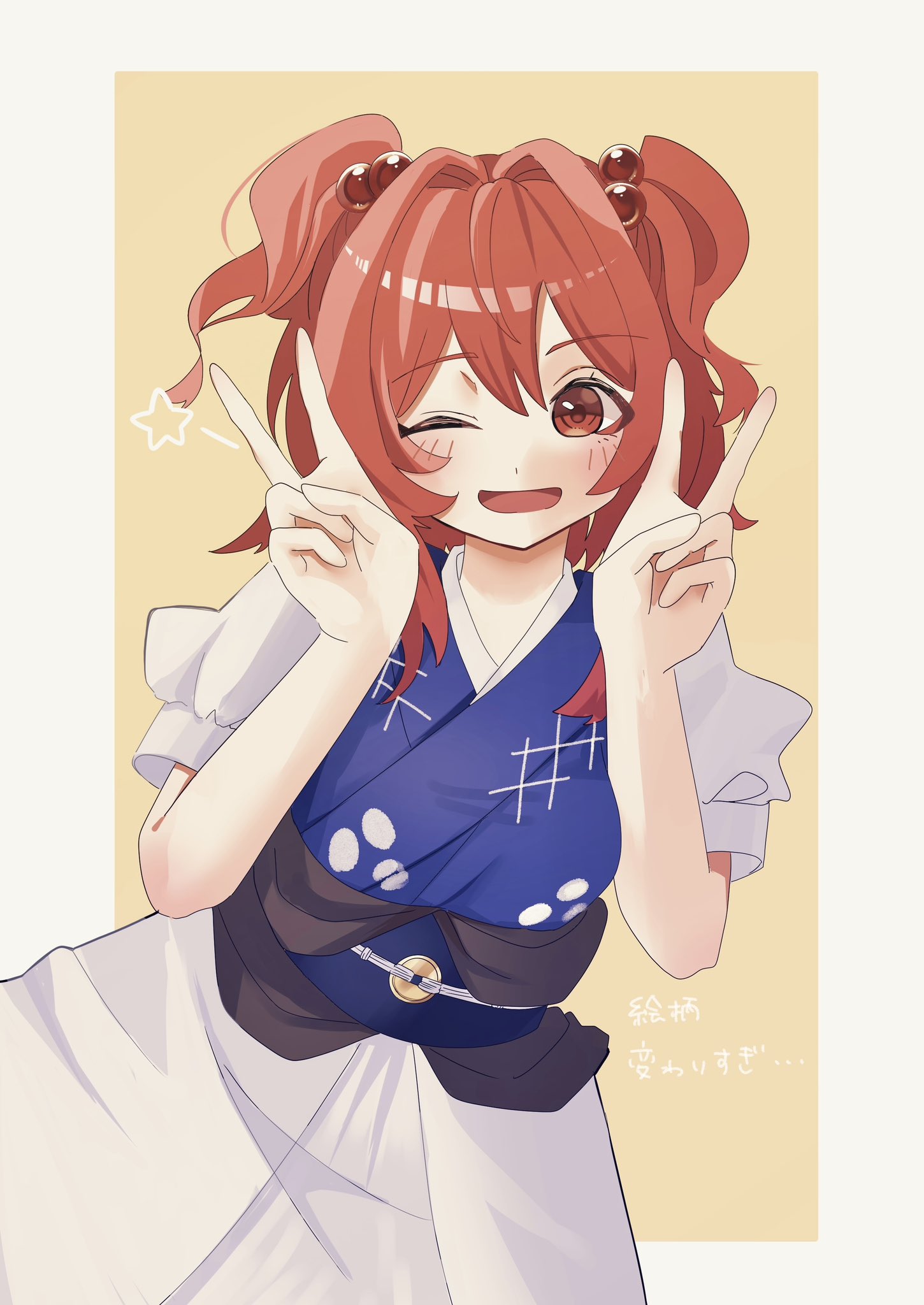 1girl ;d blush coin commentary double_v eik_s2 hair_bobbles hair_ornament highres looking_at_viewer obi one_eye_closed onozuka_komachi open_mouth red_eyes red_hair sash short_sleeves simple_background smile solo star_(symbol) touhou two_side_up v yellow_background