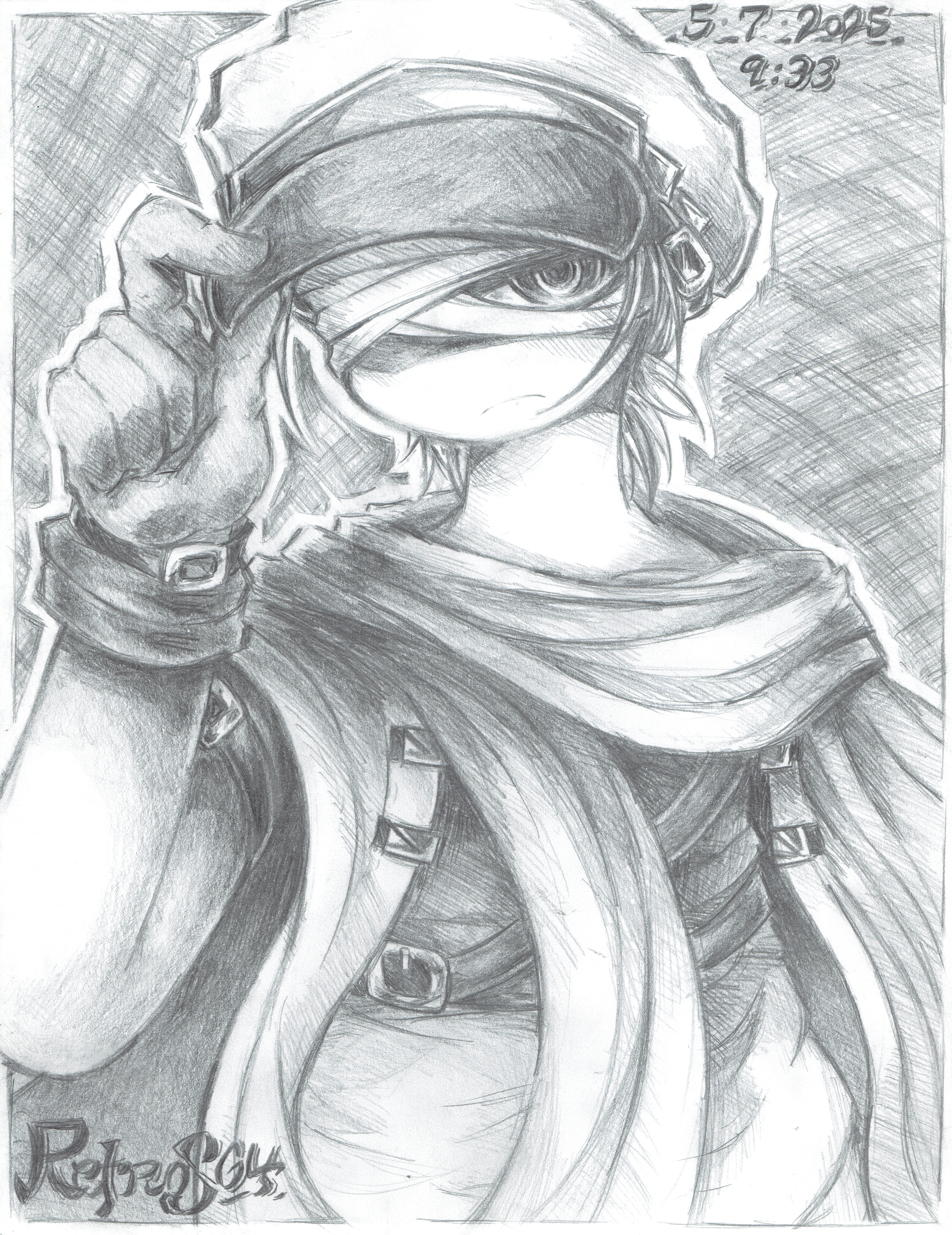 1boy absurdres bandages belt belt_buckle black_belt buckle cloak dated gloves graphite_(medium) greyscale hat highres monochrome newsboy_cap non-web_source one_eye_covered original retros64 scarf shaded_face signature sketch sleeveless solo traditional_media