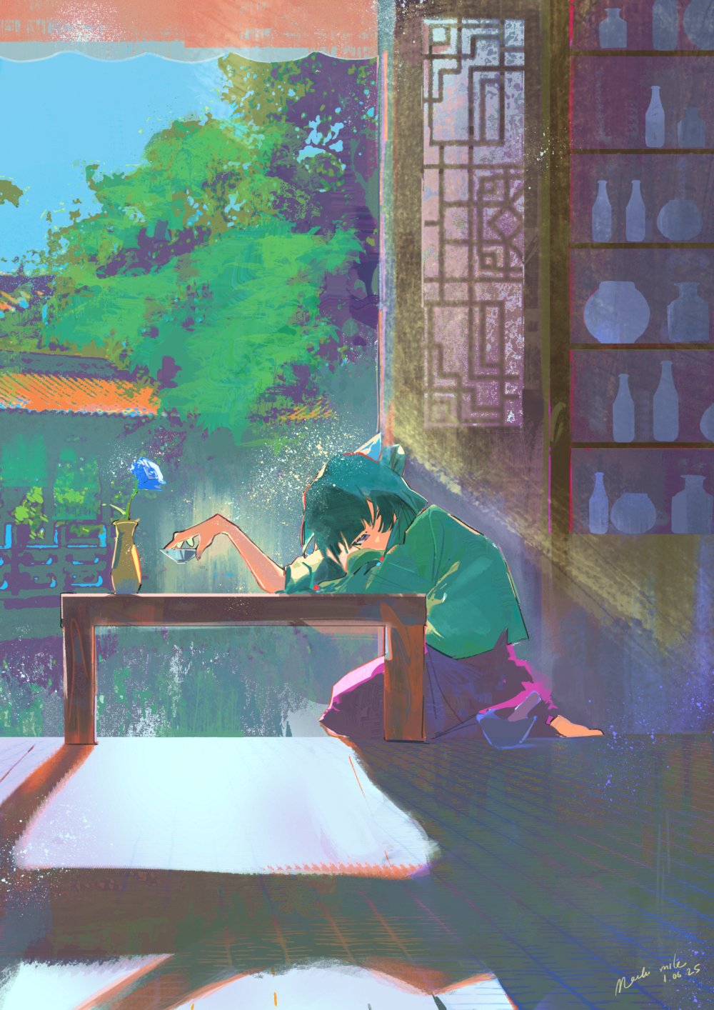 1girl barefoot blue_flower blue_rose chinese_clothes flower flower_pot green_hair highres kusuriya_no_hitorigoto machi_mile00 maomao_(kusuriya_no_hitorigoto) one_eye_closed rose sitting solo