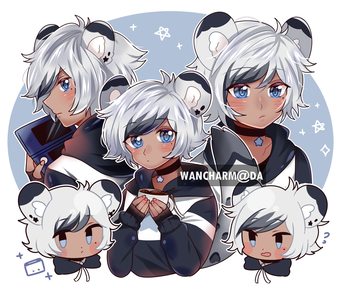 1boy ? animal_ear_fluff animal_ear_tattoo animal_ears antenna_hair artist_name black_choker black_gloves black_hair black_hoodie blue_background blue_eyes blush_stickers border chibi choker commentary commission confetti cropped_shoulders cup dark-skinned_male dark_skin english_commentary eyelashes fingerless_gloves fingernails gloves grey_hair handheld_game_console holding holding_cup holding_handheld_game_console hood hood_down hoodie leopard_boy leopard_ears leopard_tail light_blush long_sleeves looking_at_viewer male_focus mole mole_under_eye multicolored_hair multiple_views neck_ribbon nintendo_ds original outline outside_border playing_games playing_video_games pointy_nose ribbon round_border short_hair single_stripe sparkle star_(symbol) star_choker star_tattoo streaked_hair striped_clothes striped_hoodie swept_bangs tail tattoo tea teacup watermark white_border white_outline white_ribbon yuyu_(yuyupurinn)
