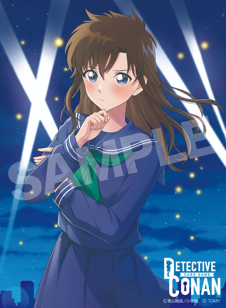 1girl black_hair blue_eyes blue_sailor_collar blue_shirt blue_skirt blush closed_mouth copyright_logo copyright_notice cowboy_shot floating_hair green_neckerchief hand_on_own_chin highres kusunokinawate logo long_hair long_sleeves looking_at_viewer magic_kaito meitantei_conan meitantei_conan_card_game nakamori_aoko neckerchief night official_art outdoors pleated_skirt sailor_collar sample_watermark school_uniform serafuku shirt skirt sky solo standing thinking watermark