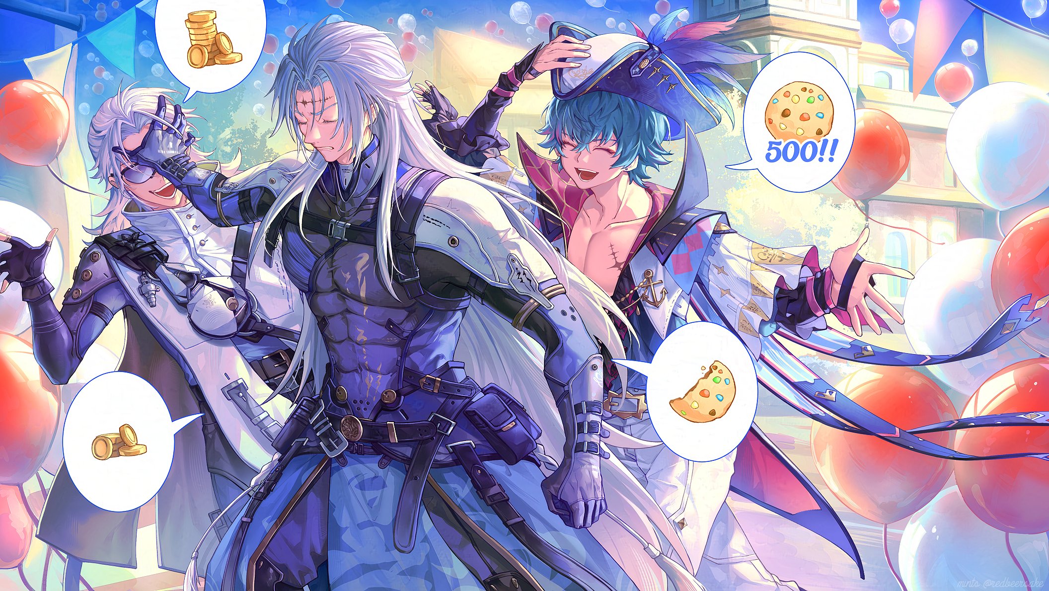 3boys aalto_(wuthering_waves) balloon black_gloves blue_hair blue_shirt brant_(wuthering_waves) calcharo_(wuthering_waves) clenched_teeth closed_eyes collarbone commentary english_commentary fingerless_gloves gloves hat hat_feather highres male_focus multiple_boys open_clothes open_mouth open_shirt outdoors pangu_terminal_(wuthering_waves) pants pushing_away redricewine shirt short_hair smile spoken_food spoken_money sunglasses tabard tacet_mark_(wuthering_waves) tactical_clothes teeth toned toned_male tricorne white_hair white_pants white_tabard wuthering_waves