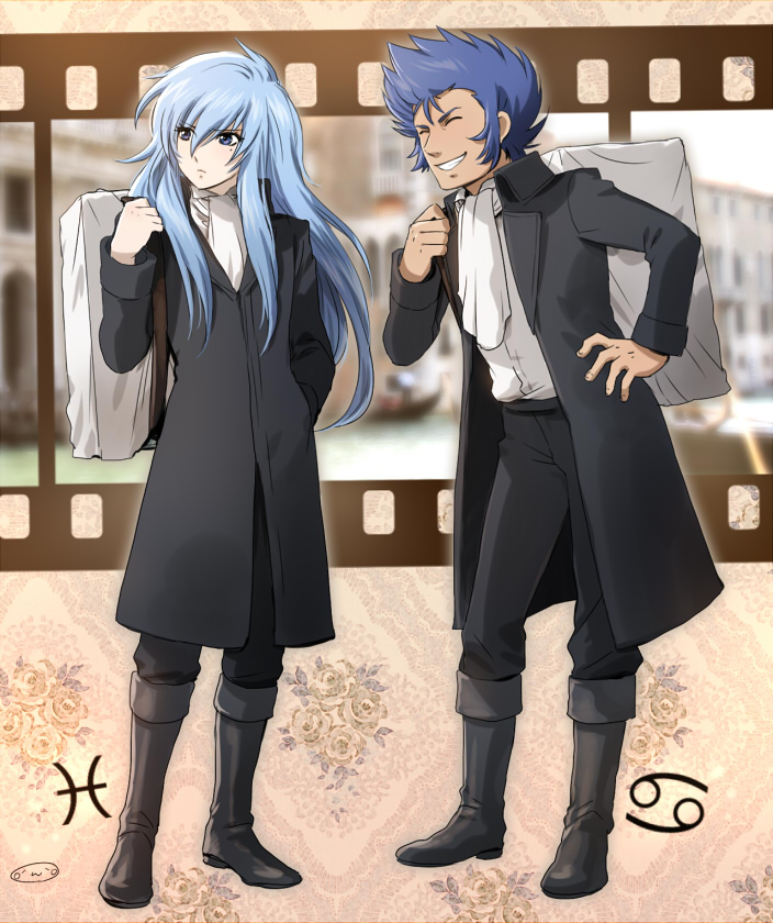2boys ^_^ ascot averting_eyes backpack bag black_boots black_coat black_pants blue_eyes blue_hair boots cancer_(symbol) cancer_manigoldo casual closed_eyes coat commentary_request film_reel grin hand_in_pocket hand_on_own_hip leaning_forward light_frown long_sleeves looking_to_the_side mizuhara_aki mole mole_under_eye multiple_boys open_clothes open_coat pants pisces_(symbol) pisces_albafica saint_seiya saint_seiya:_the_lost_canvas shirt short_hair sideburns smile spiked_hair trap white_ascot white_shirt