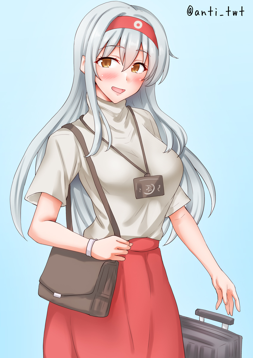 1girl anti_(untea9) aqua_background bag grey_hair hairband handbag highres id_card kantai_collection lanyard long_hair long_skirt official_alternate_costume one-hour_drawing_challenge orange_eyes red_hairband red_skirt rolling_suitcase shirt shoukaku_(jal)_(kancolle) shoukaku_(kancolle) skirt solo suitcase twitter_username white_shirt