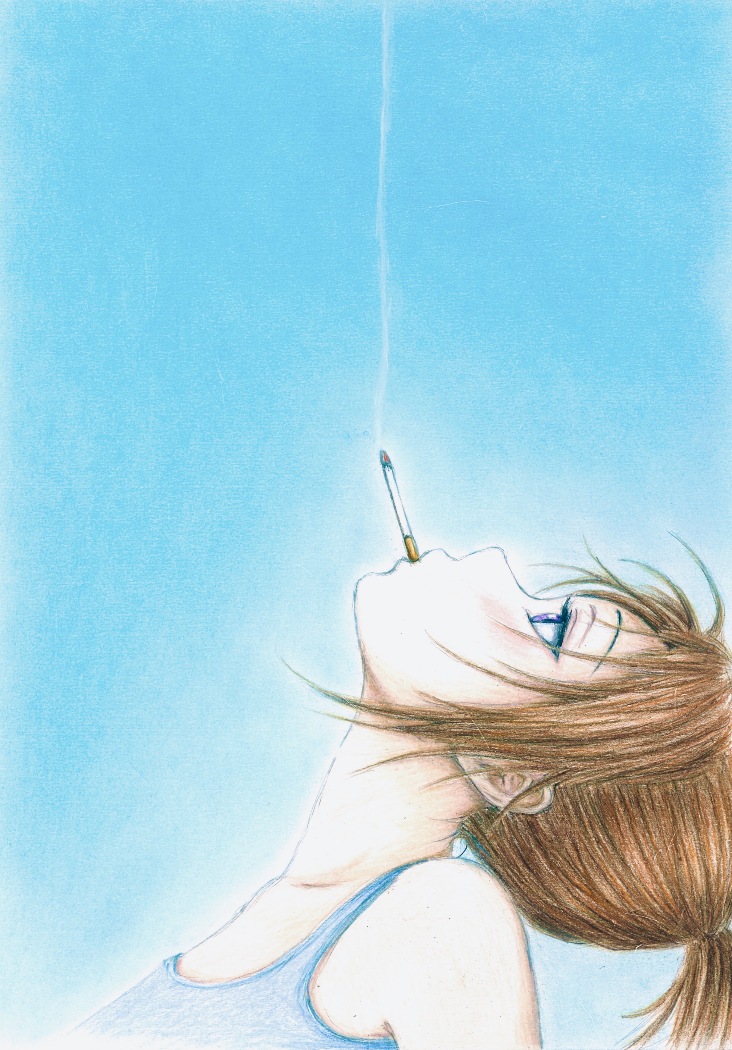 1girl absurdres bare_shoulders bbmasa blue_eyes blue_shirt blush cigarette collarbone eyelashes gradient_background hibike!_euphonium highres looking_up nakagawa_natsuki ponytail portrait shirt smoke smoking solo t-shirt traditional_media
