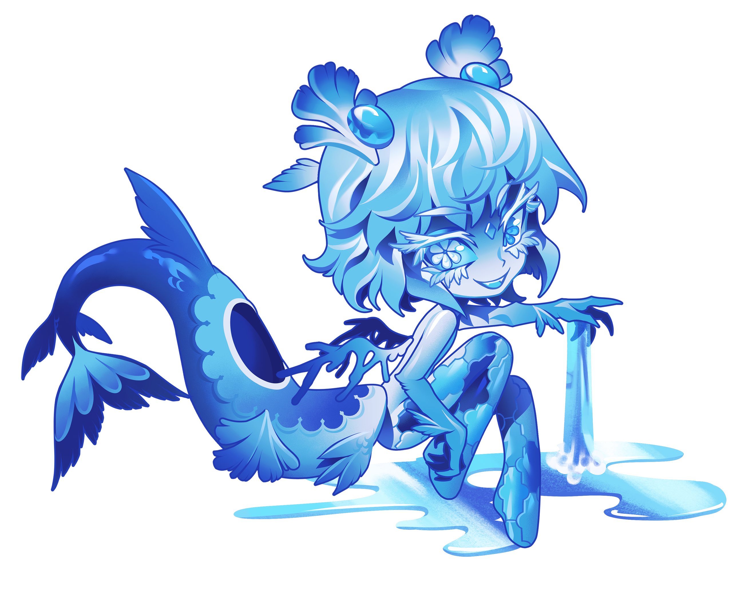 1girl adoptable arm_at_side blue_hair blue_sclera blue_skin blue_tail blue_theme blue_tongue bob_cut colored_eyelashes colored_sclera colored_skin colored_tongue eyelashes flipchers flower-shaped_eyes full_body heterochromia highres invisible_chair looking_at_viewer mini_wings mismatched_sclera monster_girl open_mouth original outstretched_arm puddle sea_slug_girl simple_background sitting smile solo white_background white_skin wings