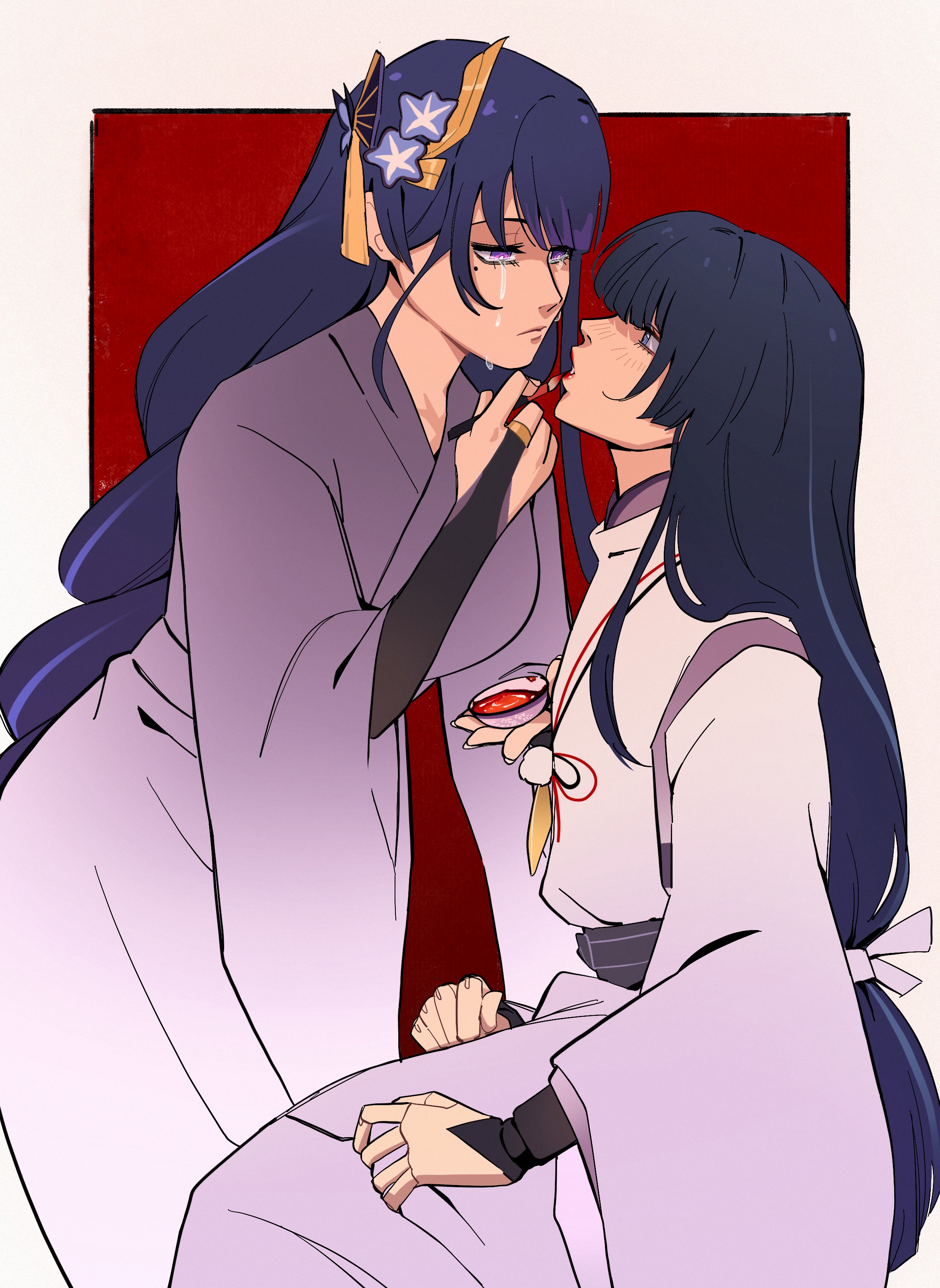 1boy 1girl absurdres applying_makeup blue_eyes blue_hair blunt_bangs braid bridal_gauntlets crying crying_with_eyes_open feathers from_side genshin_impact hair_ornament hand_up highres holding holding_brush japanese_clothes jewelry joints kimono leaning_forward light_blush long_hair long_sleeves looking_at_another looking_down low-tied_long_hair lulu_(user_mmrd2745) makeup_brush mole mole_under_eye mother_and_child mother_and_son multicolored_hair necklace parent_and_child purple_eyes purple_hair purple_kimono raiden_shogun red_lips robot_joints sad scaramouche_(genshin_impact) scaramouche_(kabukimono)_(genshin_impact) shade single_braid sitting streaked_hair streaming_tears tears trap wide_sleeves