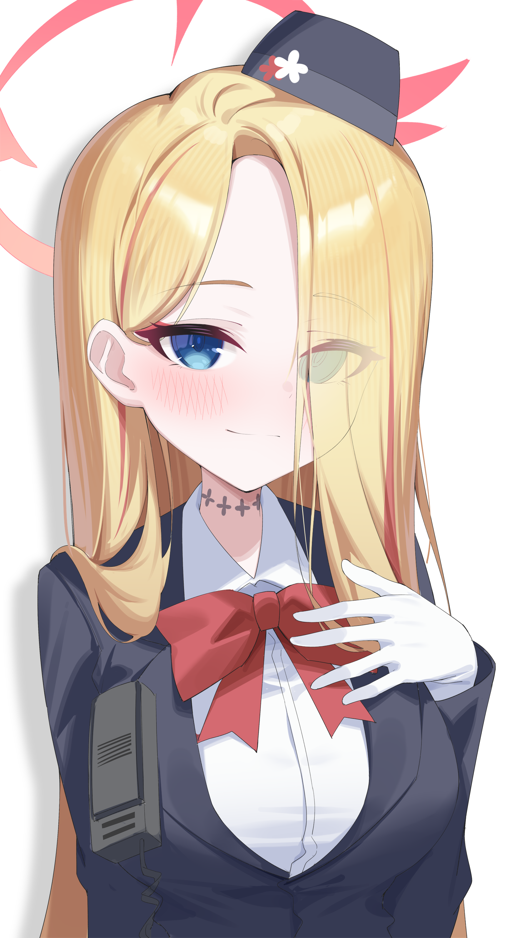 1girl absurdres black_hat black_jacket blonde_hair blue_archive blue_eyes closed_mouth collared_shirt eyes_visible_through_hair gloves hair_over_one_eye halo hat highres jacket jei_(user_tckk7448) long_sleeves looking_at_viewer pina_(blue_archive) pina_(guide)_(blue_archive) red_halo shadow shirt simple_background solo upper_body walkie-talkie white_background white_gloves white_shirt