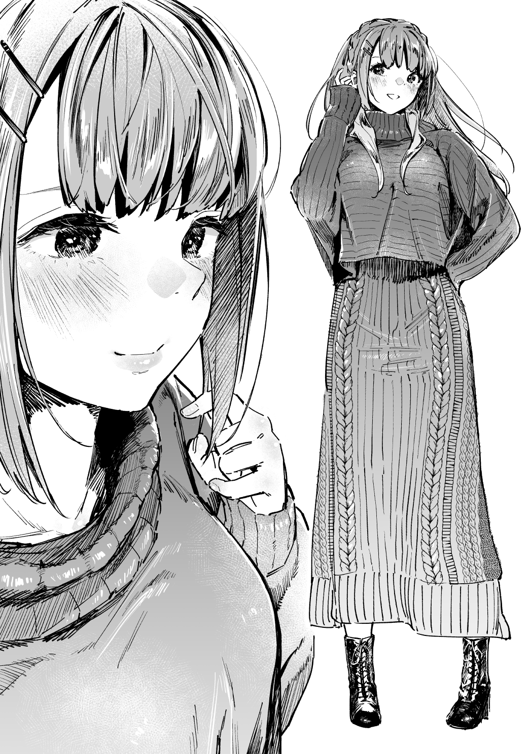 1girl blush boots closed_mouth full_body greyscale hair_ornament hairclip hand_on_own_hip hand_up highres long_hair long_skirt long_sleeves monochrome open_mouth original projected_inset sanka_kumaru simple_background skirt sleeves_past_wrists smile sweater turtleneck turtleneck_sweater white_background