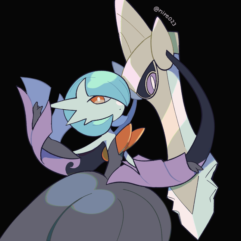 aegislash alternate_color artist_name black_background black_dress black_gloves blue_hair bob_cut colored_skin dress elbow_gloves gardevoir gen_3_pokemon gen_6_pokemon gloves mega_gardevoir mega_pokemon ni_re nintendo one-eyed orange_eyes pokemon pokemon_(creature) purple_eyes shiny_pokemon simple_background strapless strapless_dress sword weapon white_skin