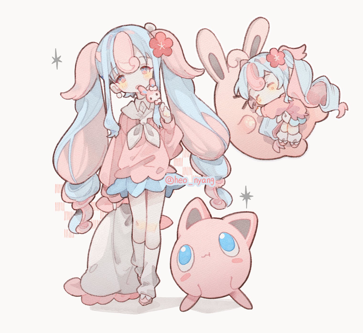 1girl blue_eyes blue_hair chibi closed_mouth commission fairy_miku_(project_voltage) full_body gen_1_pokemon hatsune_miku heo_nyang highres jigglypuff multicolored_hair multiple_views nintendo pink_hair pokemon pokemon_(creature) project_voltage simple_background twintails two-tone_hair vocaloid white_background wigglytuff