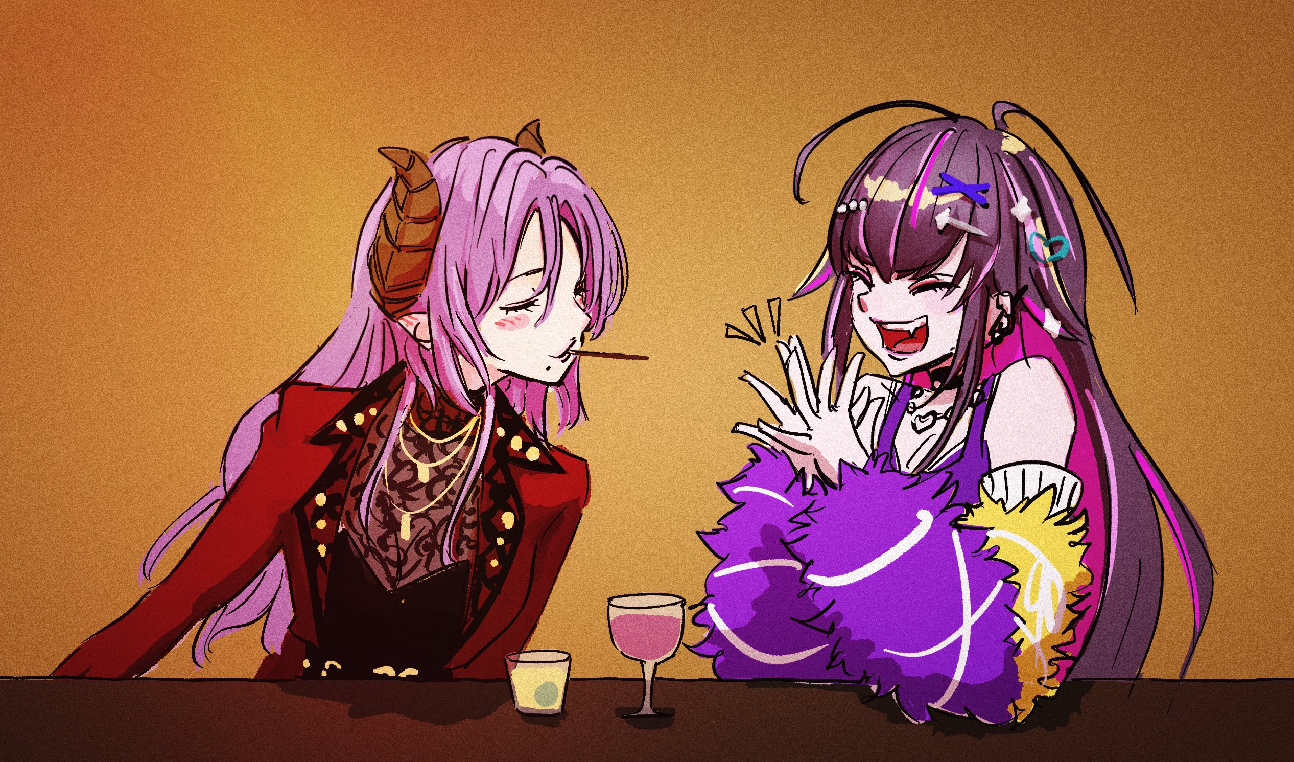 2girls black_shirt brown_horns clapping closed_eyes coat cocktail colored_inner_hair commentary_request counter cup demon_girl demon_horns detached_sleeves food food_in_mouth fur_sleeves hair_ornament hairclip highres hironoshin_110 horns lace_shirt long_hair mole mole_under_mouth multicolored_hair multiple_girls nanashi_inc. open_mouth orange_background pocky pocky_in_mouth pointy_ears purple_hair purple_sleeves purple_tank_top red_coat saionji_mary saionji_mary_(10th_costume) shirt smile tank_top upper_body uruwashi_ririri virtual_youtuber