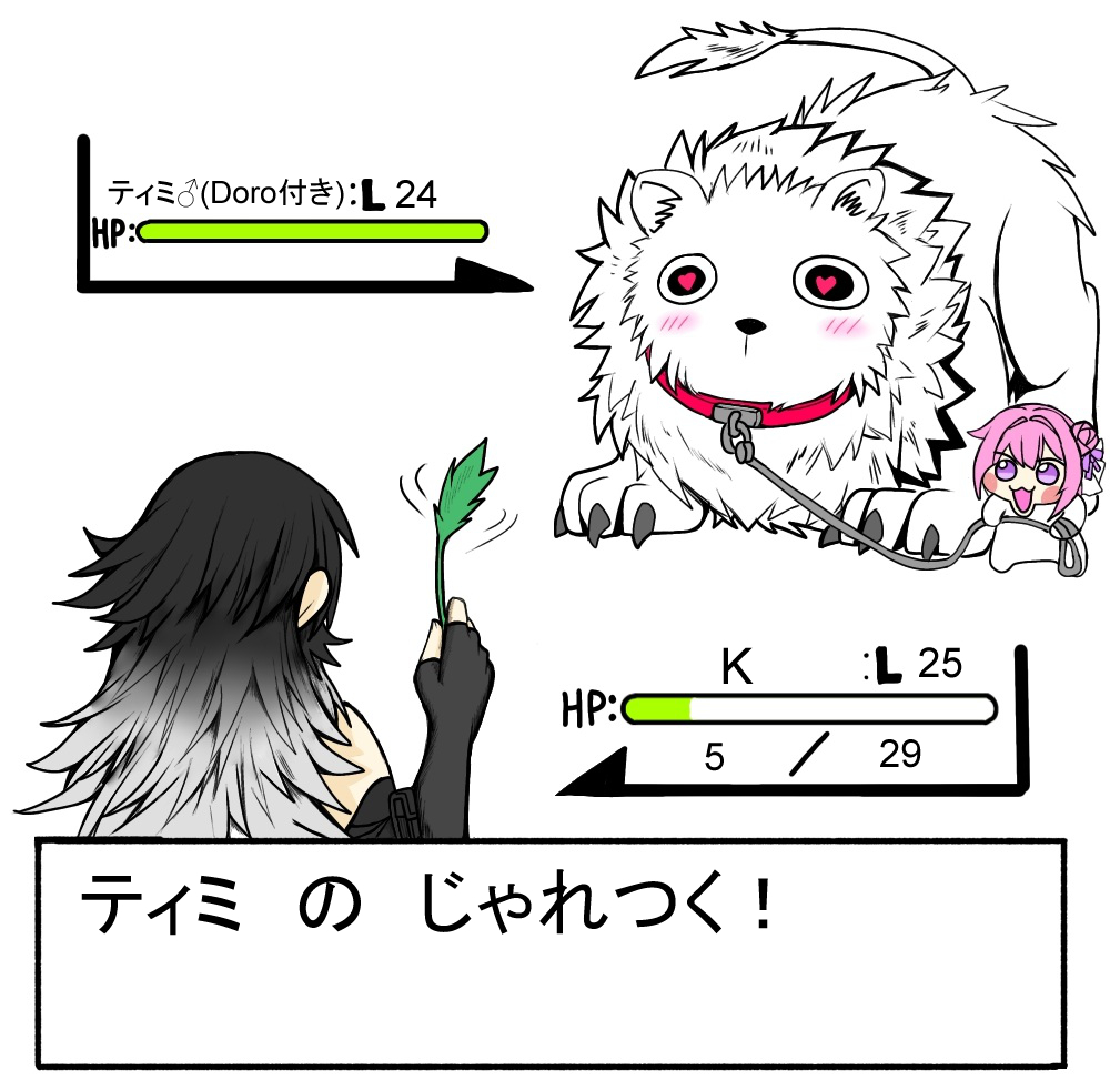 2girls all_fours bare_shoulders black_hair blush cat_teaser claws collar commentary_request doro_(nikke) elbow_gloves fake_screenshot fingerless_gloves from_behind gloves goddess_of_victory:_nikke gradient_hair hair_bun hand_up health_bar heart heart-shaped_pupils holding holding_cat_teaser k_(nikke) leash lion mane messy_hair multicolored_hair multiple_girls neko_kyo nintendo pink_eyes pink_hair pokemon simple_background single_side_bun symbol-shaped_pupils timi_(nikke) translation_request white_background white_hair