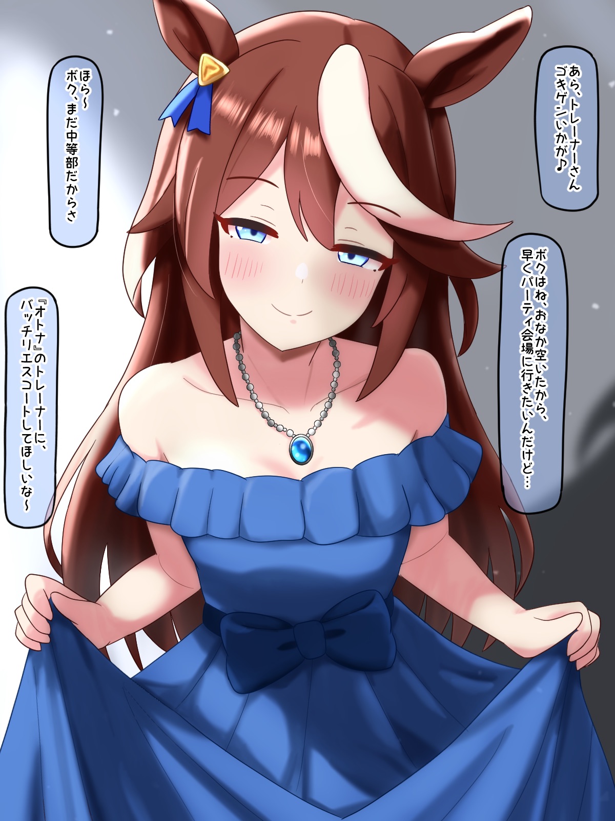 1girl animal_ears blue_eyes blush bow brown_hair commentary_request cowboy_shot dress dress_bow ear_ribbon half-closed_eyes highres horse_ears horse_girl jewelry long_hair looking_at_viewer multicolored_hair necklace peruninjin smile solo speech_bubble streaked_hair tokai_teio_(umamusume) translation_request umamusume white_hair