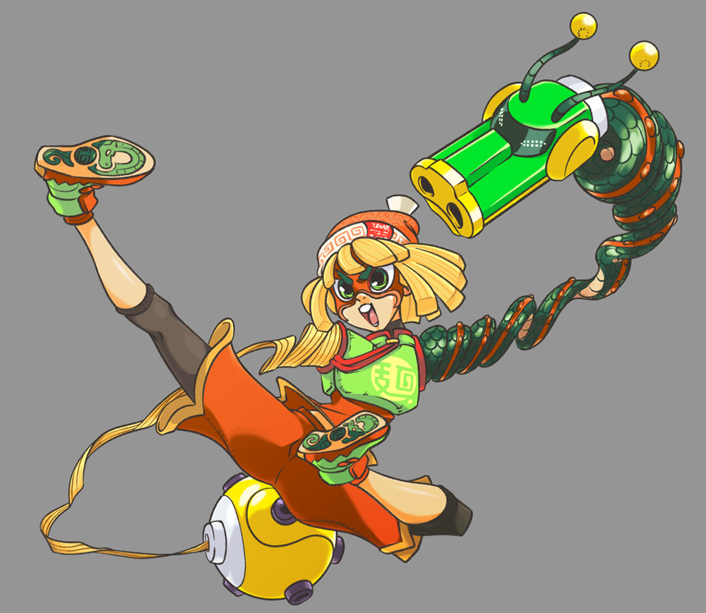1girl 3d_rod! arms_(game) beanie blonde_hair dragon_(arms) extendable_limbs eye_mask green_eyes grey_background hat kicking leggings_under_shorts mask megawatt_(arms) min_min_(arms) open_mouth shorts simple_background solo