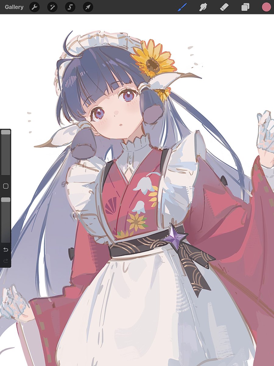 1girl art_program_in_frame blue_hair blunt_bangs blunt_tresses commentary cowboy_shot flower gloves hair_flower hair_ornament half_gloves highres japanese_clothes kimono long_hair long_sleeves maid maid_headdress nanoha_(stella_sora) procreate_(medium) purple_eyes red_kimono simple_background solo soybean_(hisoybean) stella_sora sunflower sunflower_hair_ornament wa_maid white_background white_gloves yellow_flower