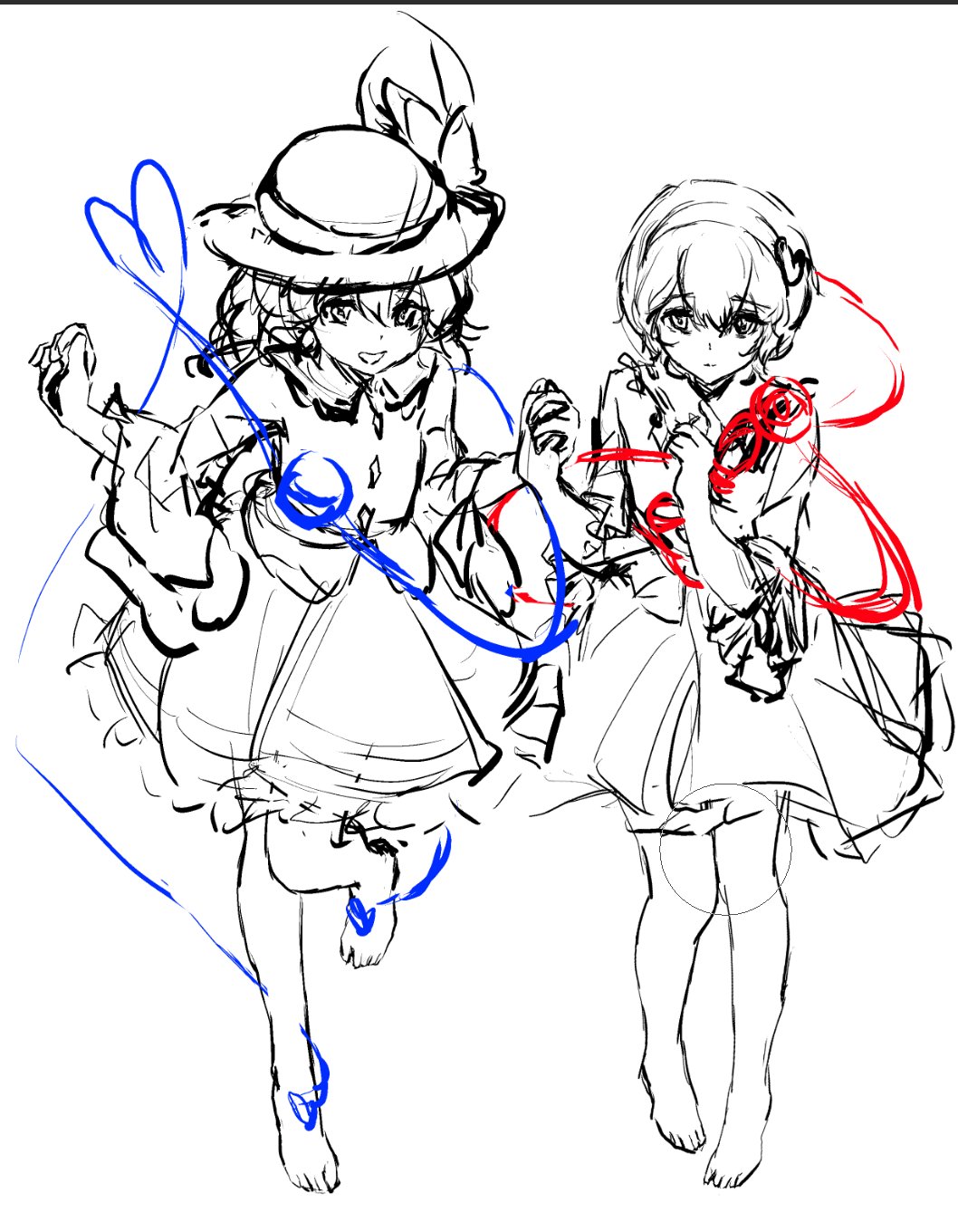 2girls barefoot black_outline bowler_hat full_body greyscale hat highres holding_hands komeiji_koishi komeiji_satori llbzqsj medium_hair monochrome multiple_girls outline spot_color touhou white_background