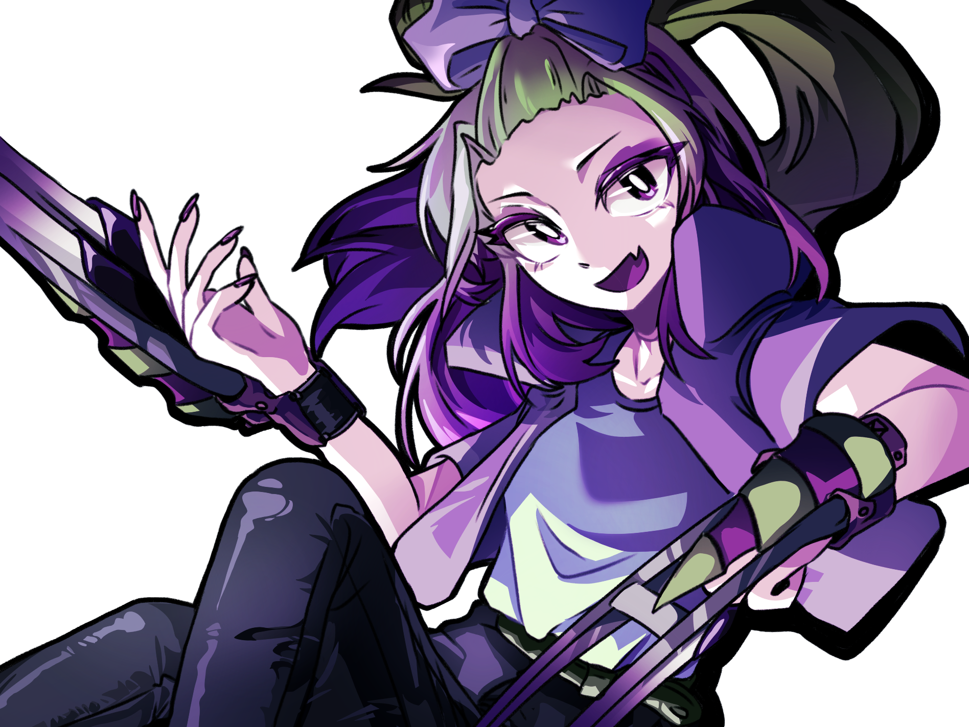 1girl :d bangs_pinned_back black_pants bow bright_pupils character_name chinese_commentary claw_(weapon) collarbone collared_jacket colored_eyelashes colored_tongue commentary_request eyeshadow fang feet_out_of_frame gradient_hair grey_shirt hair_bow high_ponytail highres jacket knee_up long_hair looking_at_viewer makeup multicolored_hair nail_polish open_clothes open_jacket open_mouth pants personification pink_nails plants_vs._zombies plants_vs._zombies_2 pokra_(plants_vs._zombies) ponytail procreate_(medium) purple_bow purple_eyes purple_eyeshadow purple_jacket purple_tongue shenmeshihou shirt short-sleeved_jacket short_sleeves simple_background sitting skin_fang smile solo transparent_background two-tone_hair underlighting weapon white_pupils